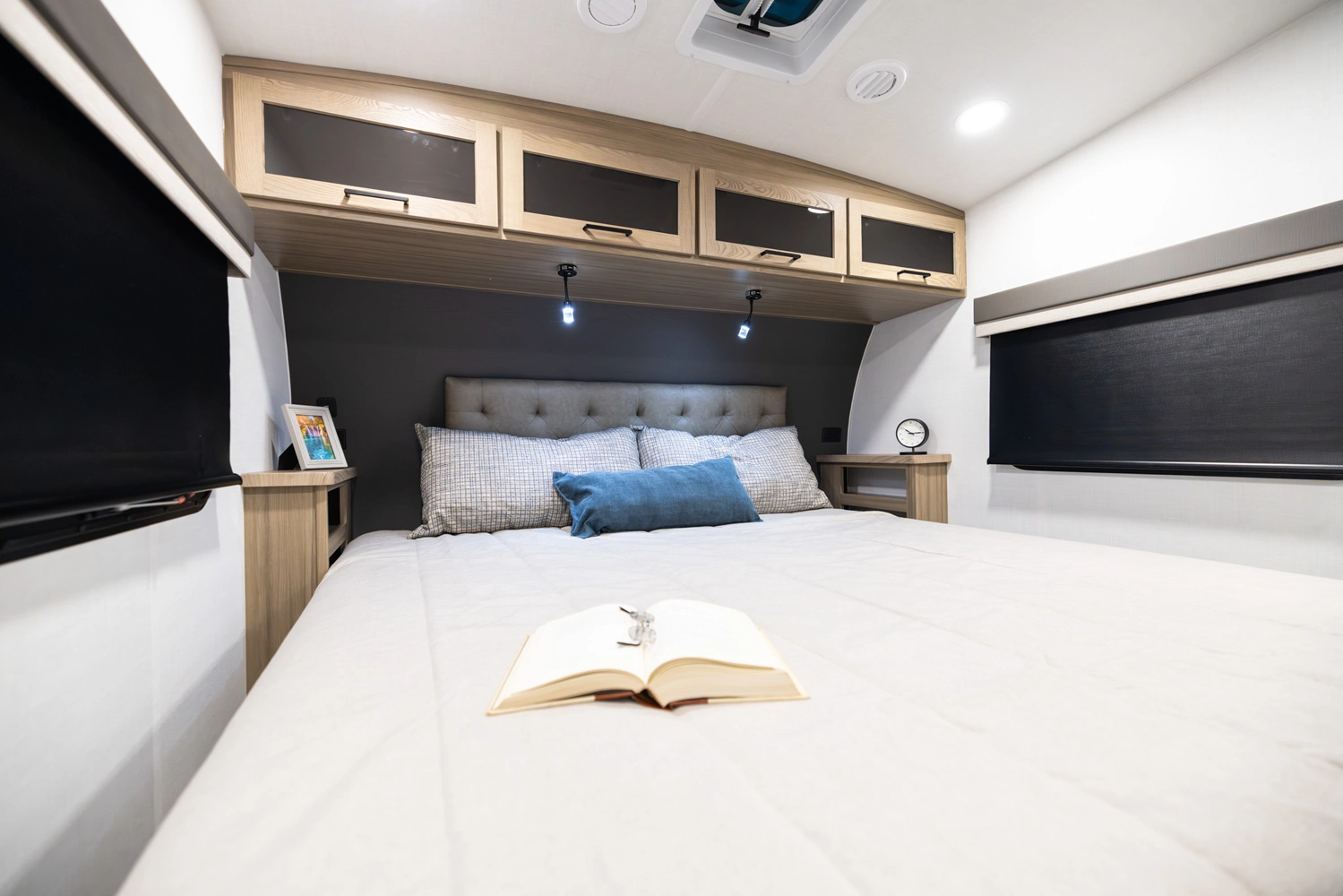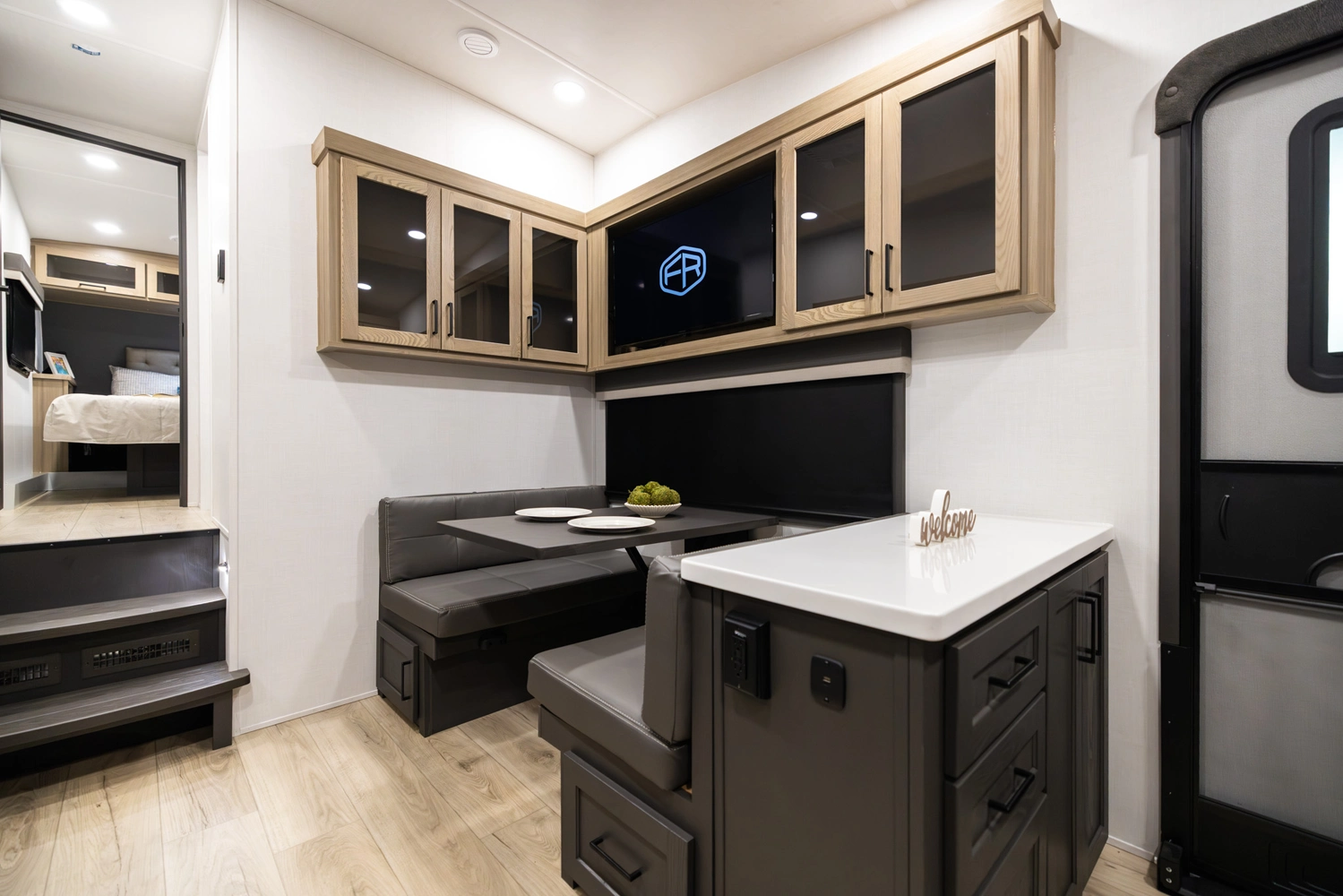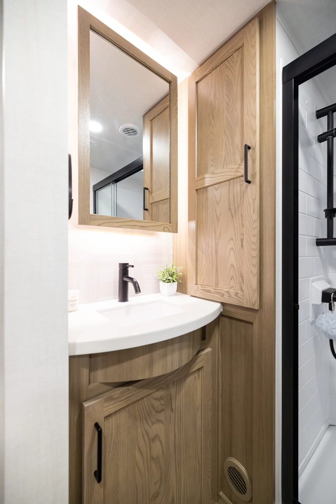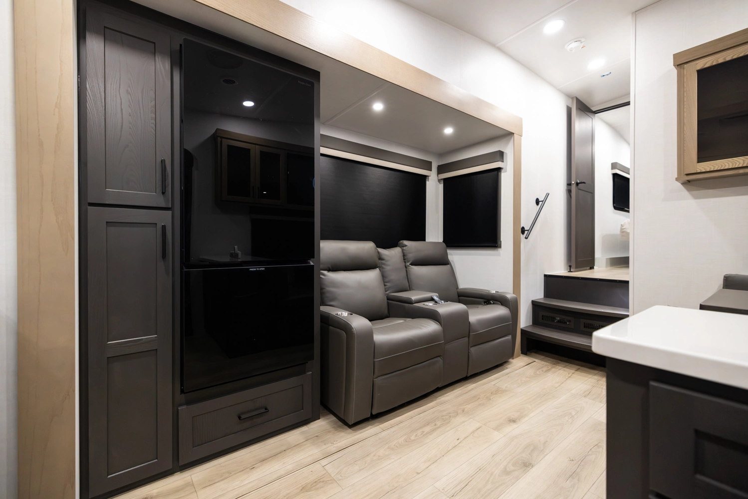 This under-30’ fifth wheel packs luxury into a compact design! Enjoy a spacious living area with a 67" theater seat, 44" dinette, and entertainment center with TV. The kitchen offers a pantry, fridge, and plenty of counter space, while the private front bedroom includes a queen bed (king optional) and wardrobe storage. With a roomy bathroom, pass-thru storage, and a 20' awning, it’s the perfect blend of comfort and easy towing.