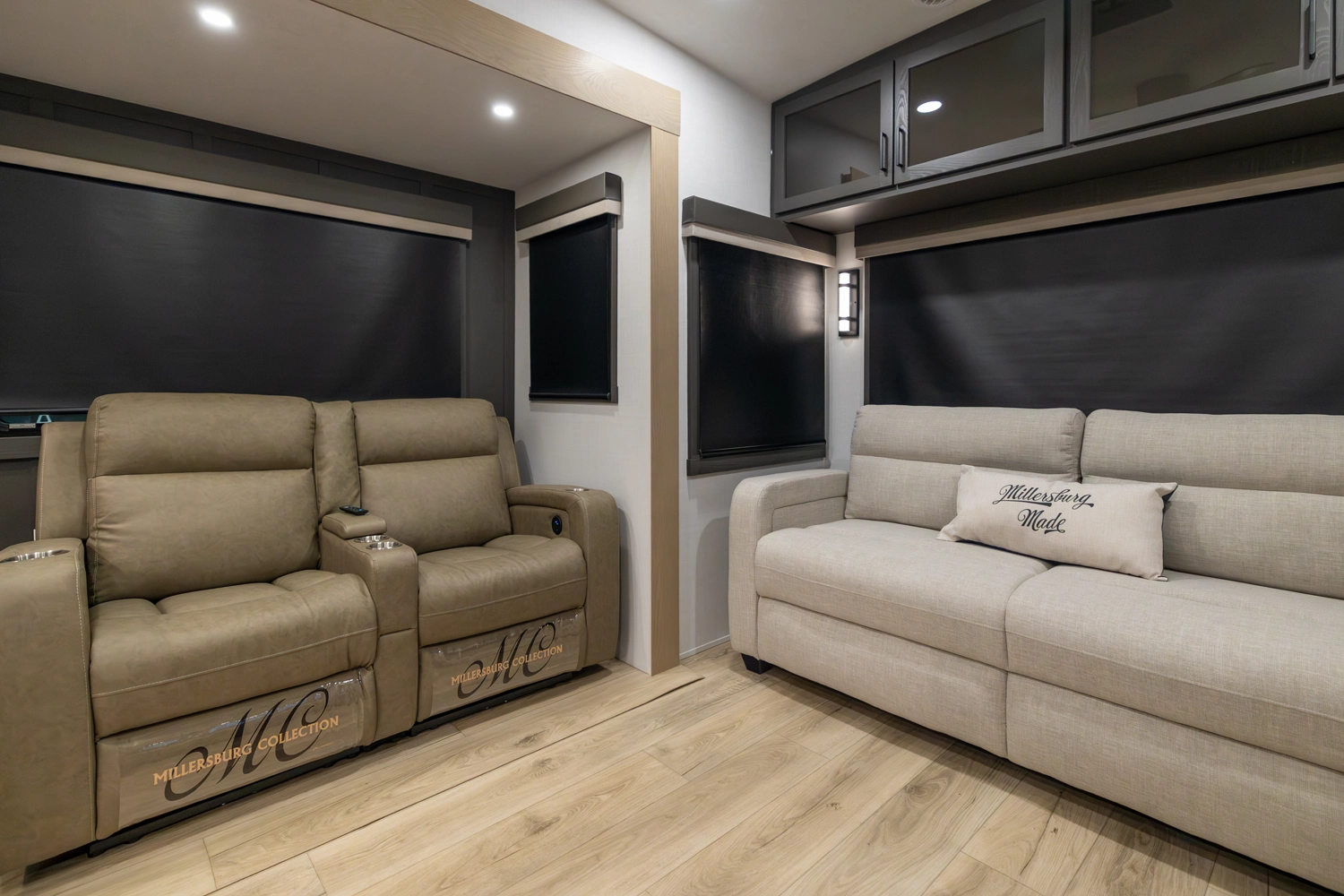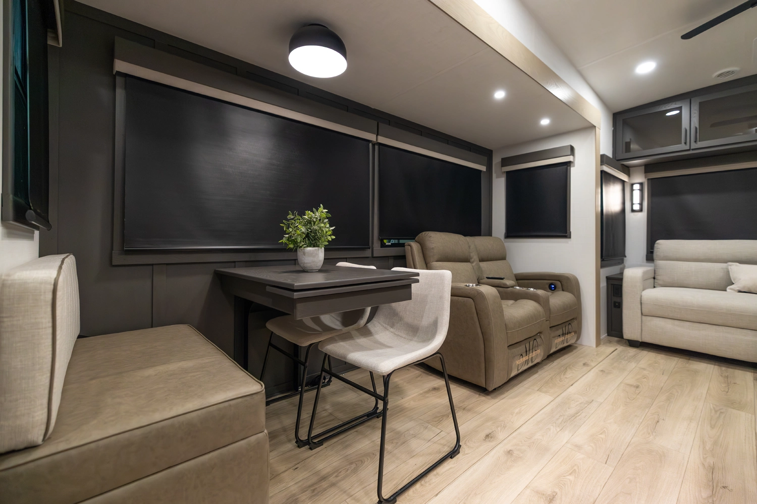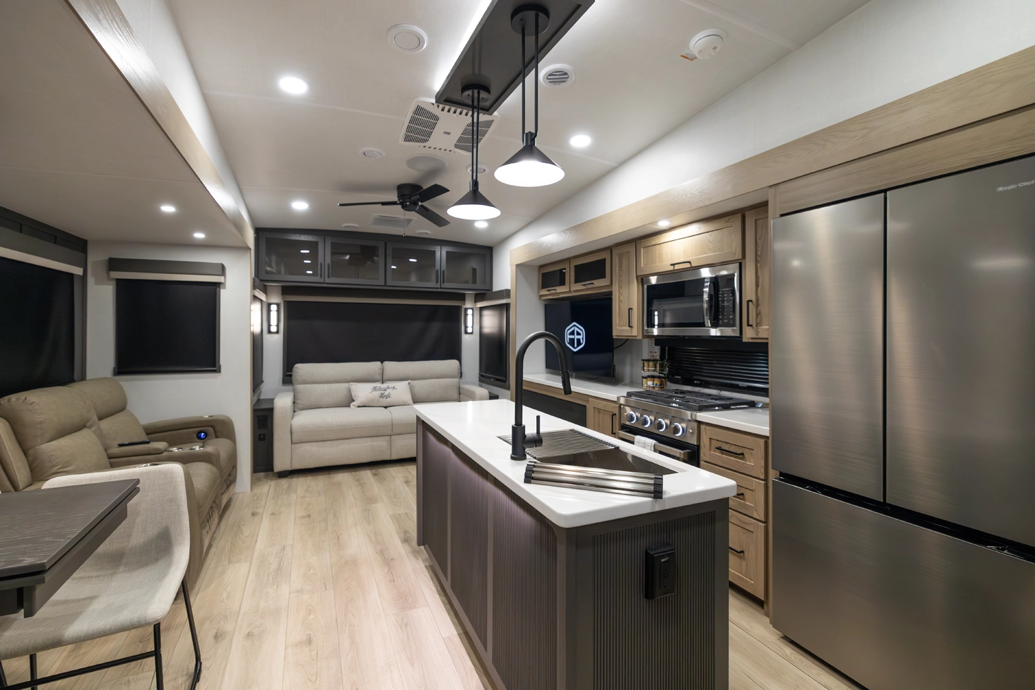 This elegant rear living unit offers a 76" hide-a-bed sofa, 60" theater seating, and a fireplace with TV for ultimate relaxation. The kitchen features an island, pantry, and ample counter space, while the dining area includes a table with chairs and bench seating. The front bedroom boasts a king bed, washer/dryer prep, dresser, and wardrobe storage. With dual awnings and pass-thru storage, it’s built for comfort and convenience.