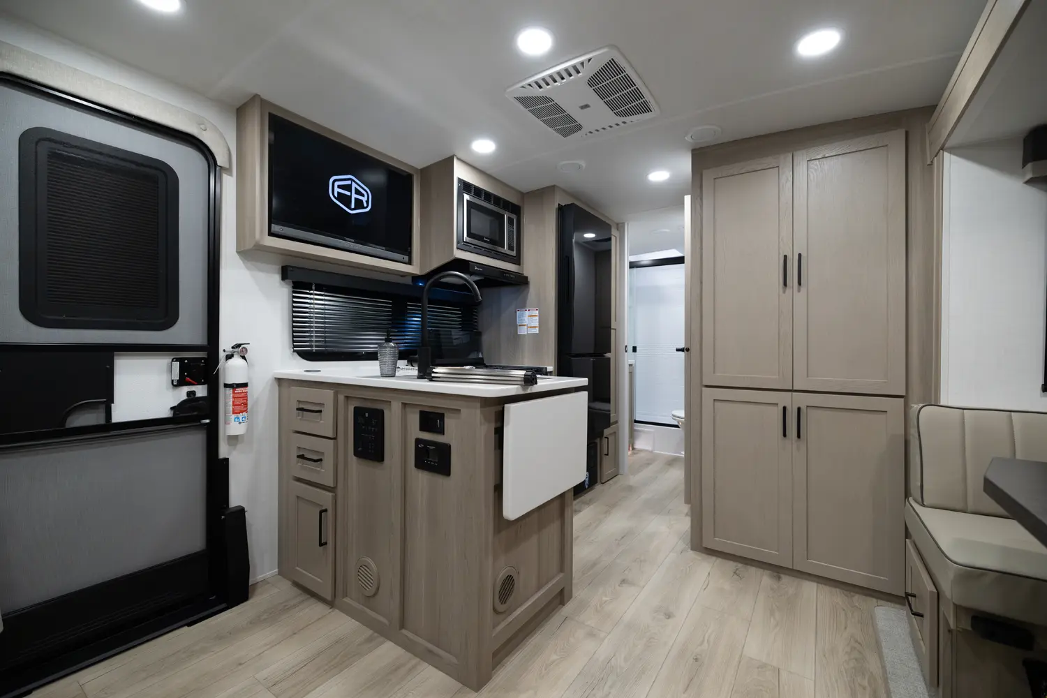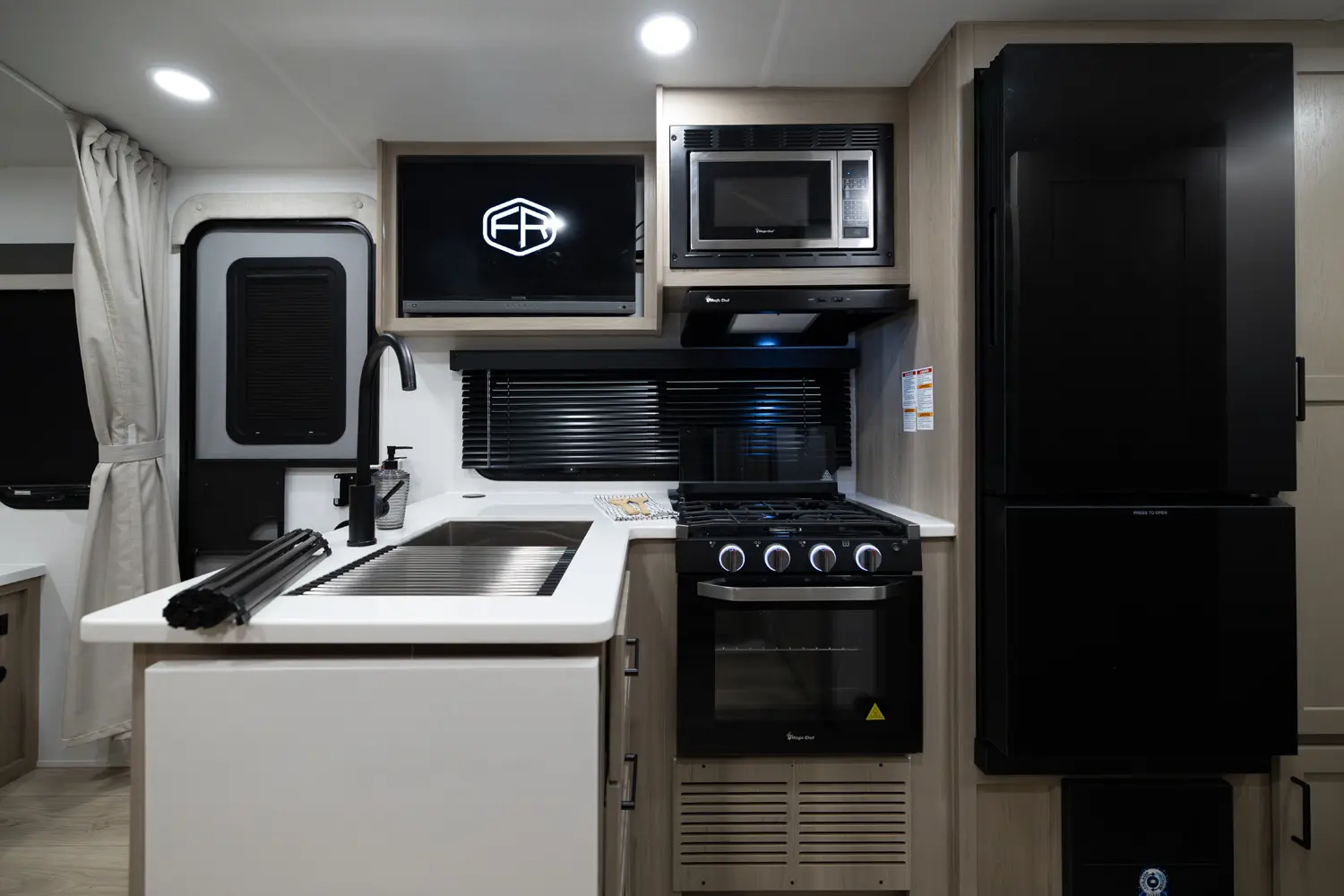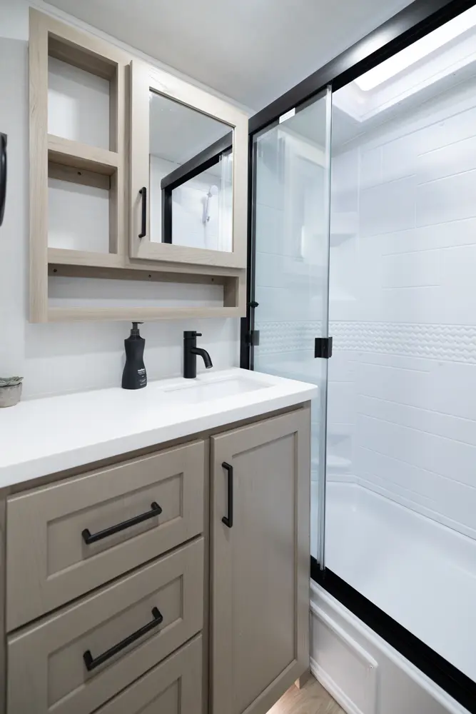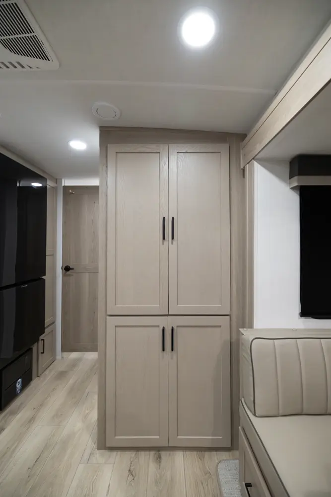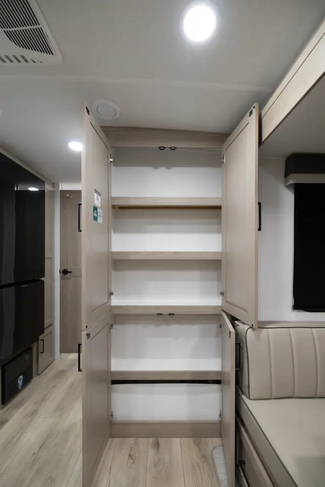 The 25FBH is built for comfort and family fun, featuring a private rear bunk room that gives kids (or guests) their own space. In the main area, you’ll find a massive U-shaped dinette perfect for meals and lounging, plus a front Murphy bed that easily converts to maximize living space. A large rectangular shower in the bathroom adds everyday convenience, making the 25FBH a great choice for families who want room to relax and recharge on every adventure.