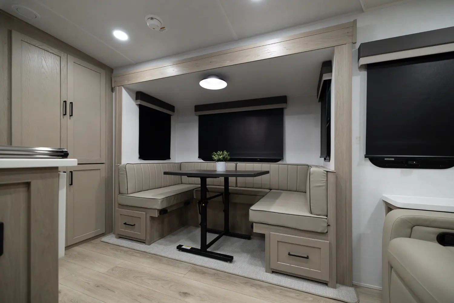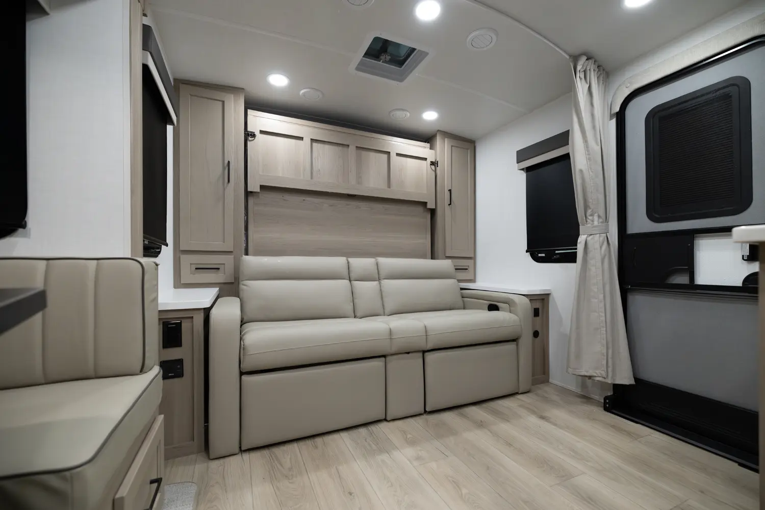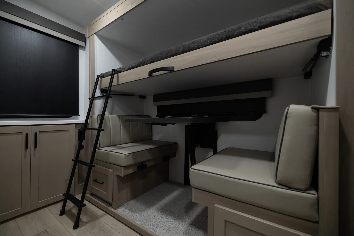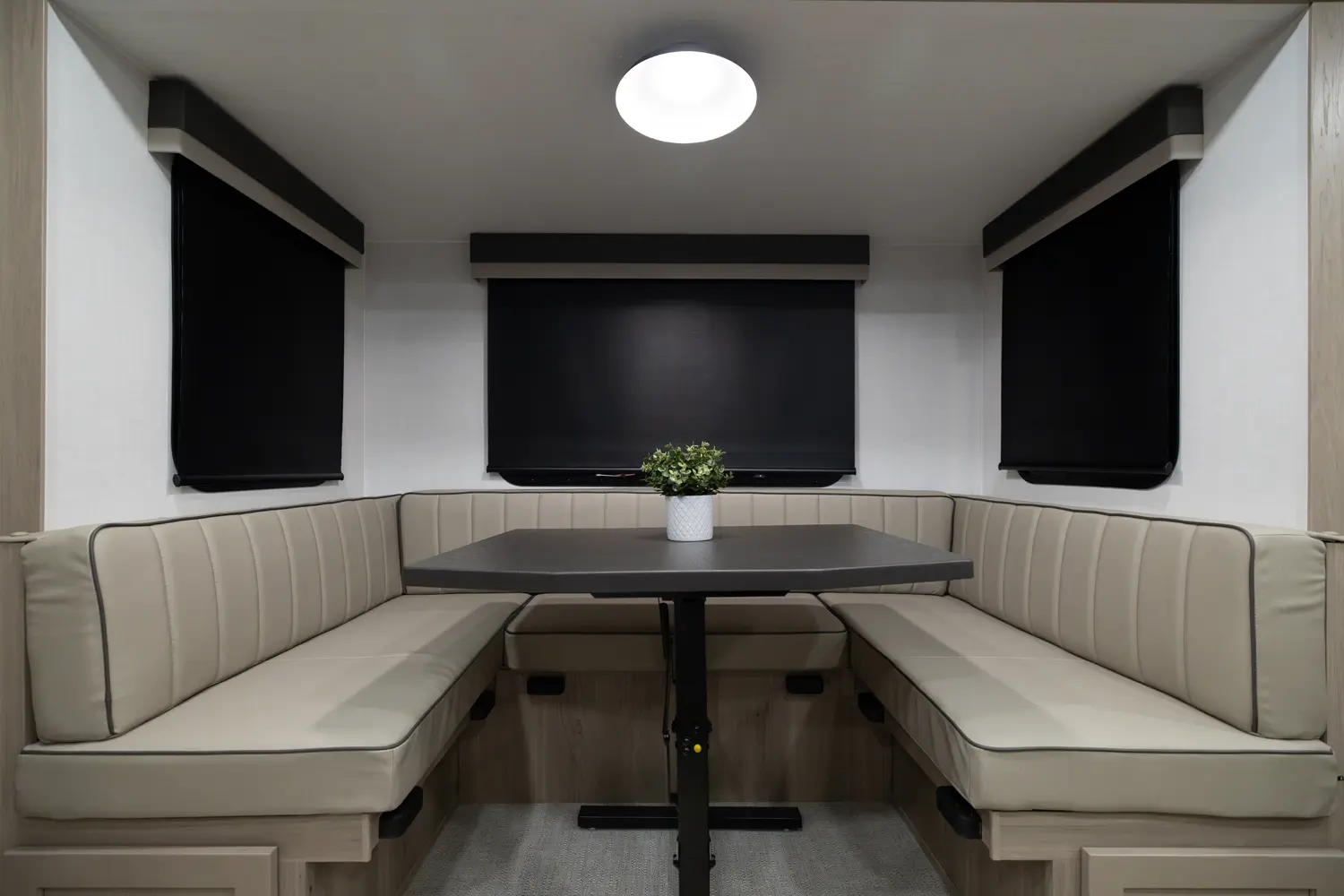 The 25FBH is built for comfort and family fun, featuring a private rear bunk room that gives kids (or guests) their own space. In the main area, you’ll find a massive U-shaped dinette perfect for meals and lounging, plus a front Murphy bed that easily converts to maximize living space. A large rectangular shower in the bathroom adds everyday convenience, making the 25FBH a great choice for families who want room to relax and recharge on every adventure.