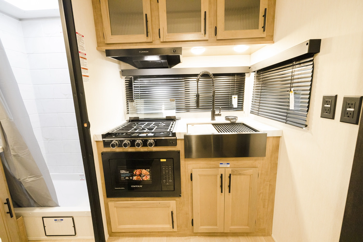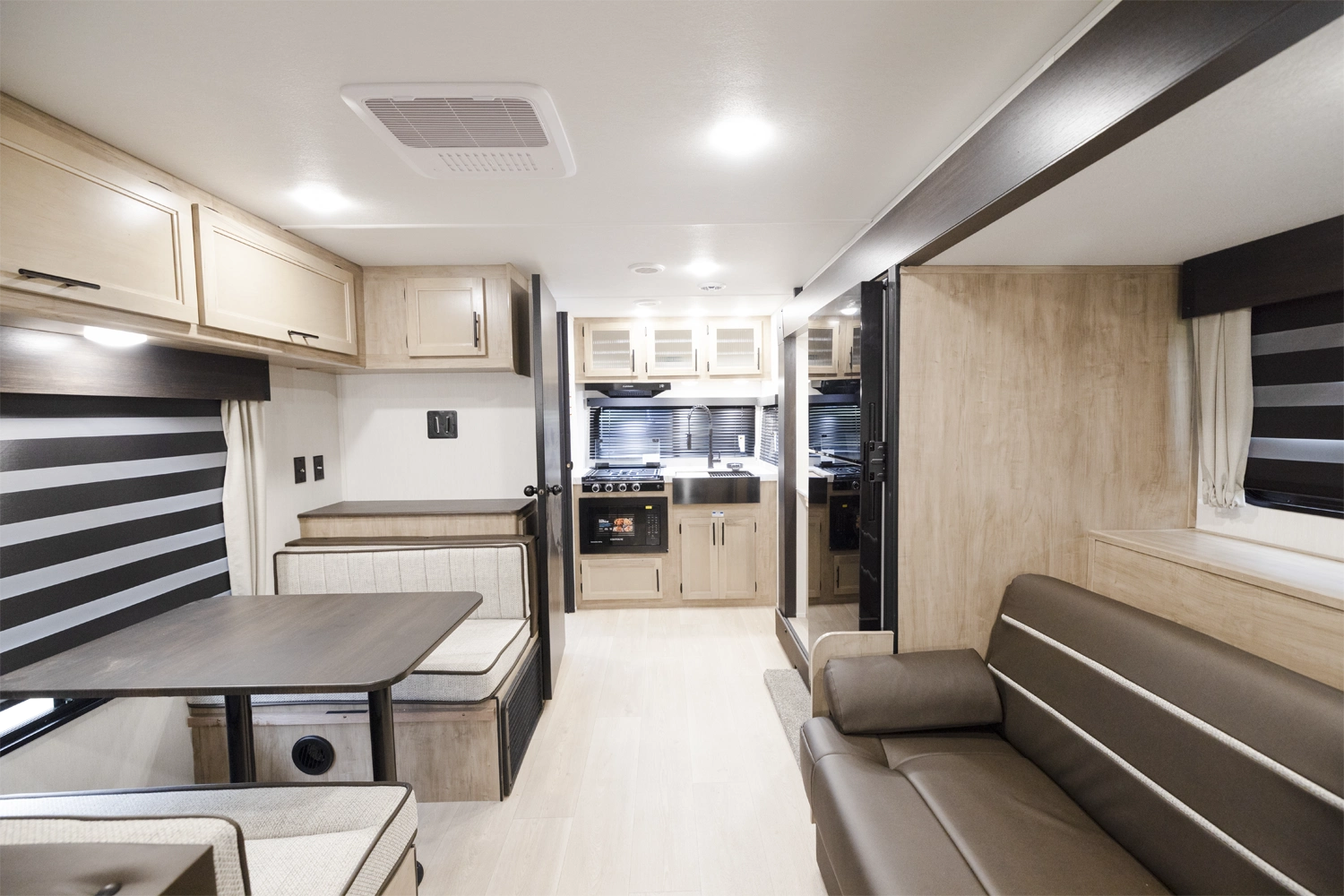 The Grey Wolf 22CE by Forest River is a stylish and functional travel trailer. Its open-concept design, featuring a bedroom, living room, and kitchen seamlessly blended together, maximizes space and creates a spacious feel. The 22CE offers a full bathroom, a large pantry, a 12-volt refrigerator, an air fryer combo microwave, and a king-size bed for ultimate comfort. The convertible dinette and sofa provide additional sleeping options, making it perfect for family trips or entertaining guests.