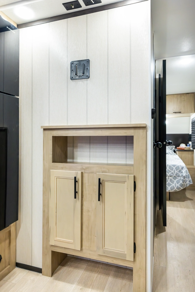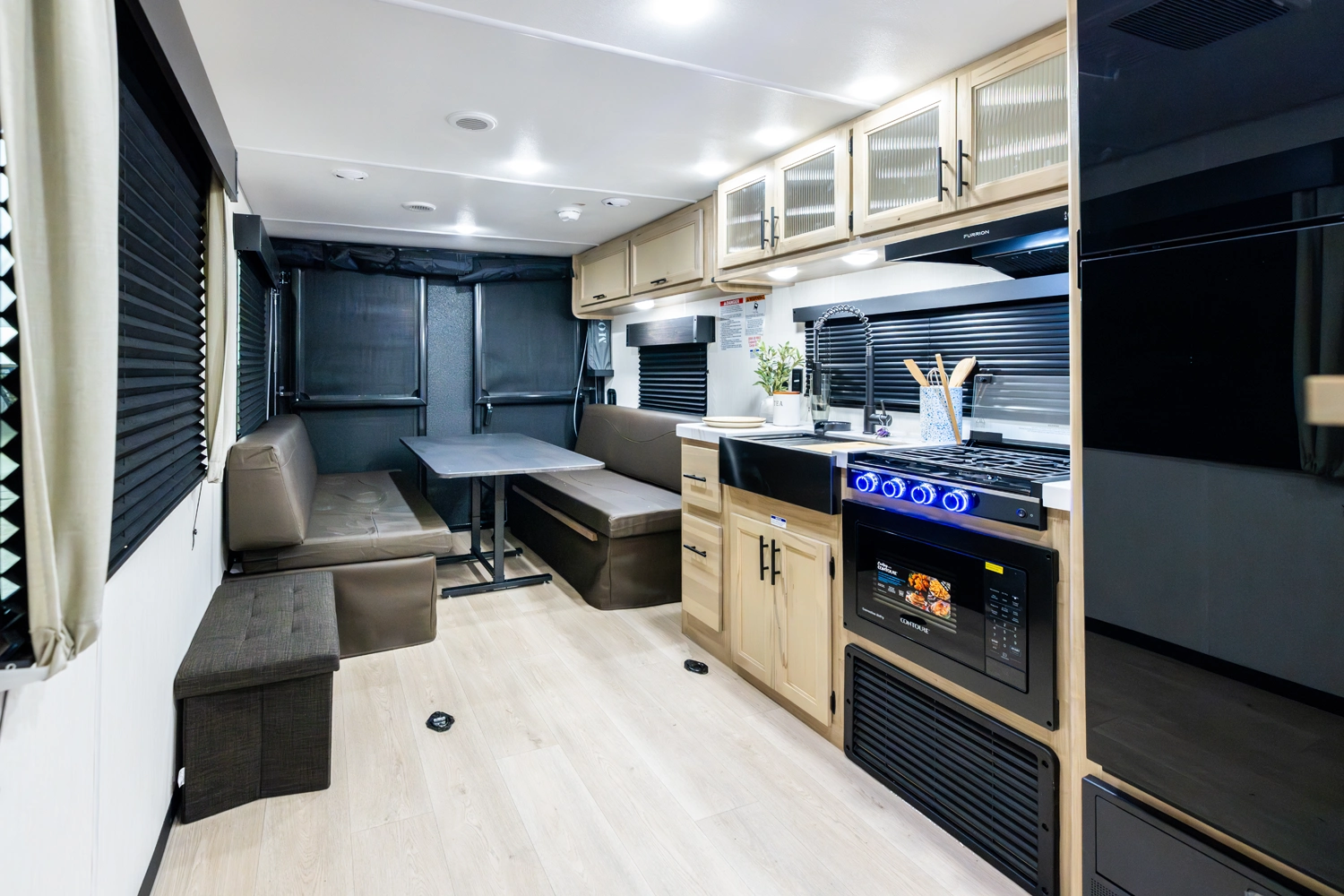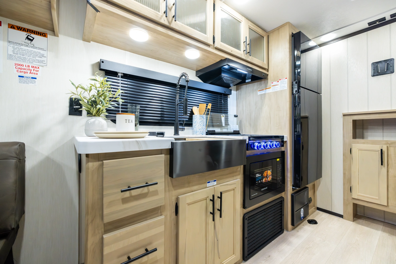 The Grey Wolf Toy Hauler by Forest River is the perfect RV for outdoor enthusiasts. The spacious garage can accommodate your toys, while the outdoor kitchen, shower, and patio area provide the ultimate outdoor living experience. Inside, you'll find a luxurious bedroom with a walk-around queen bed and a well-appointed bathroom. The modern kitchen, with its black stainless steel farm sink and sink cover, is perfect for cooking and entertaining.