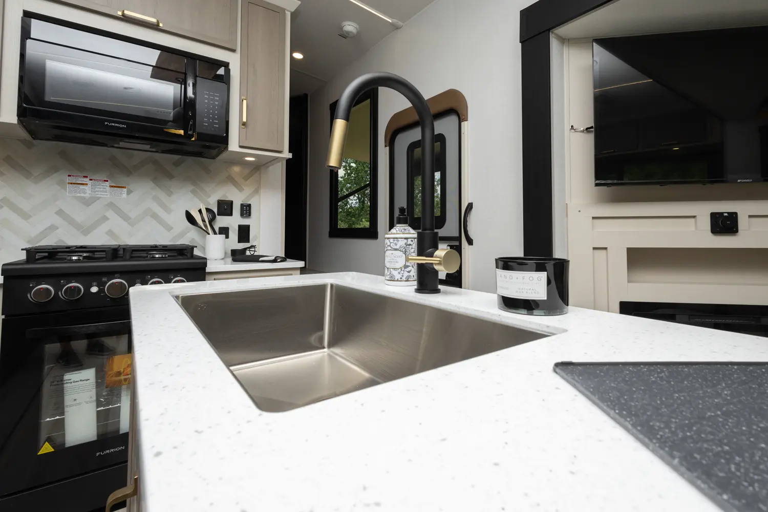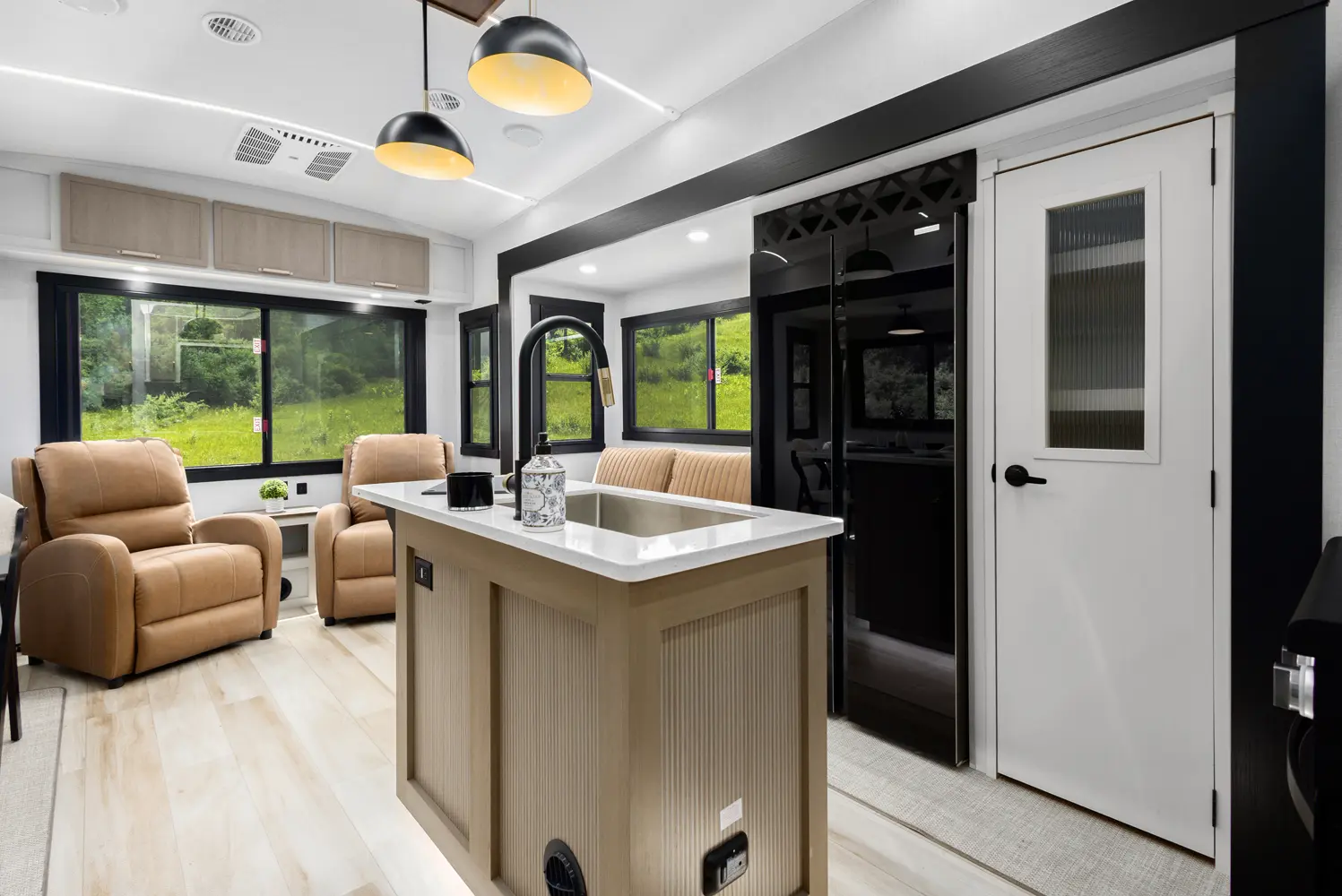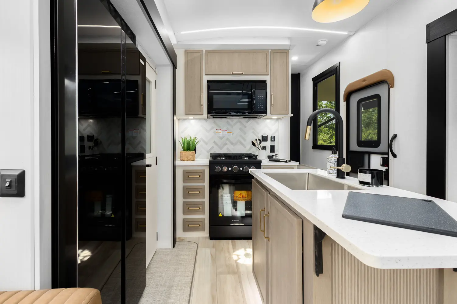 6.5' ceilings in the upper deck (bathroom & bedroom), stackable washer/dryer prep in the expansive wardrobe, and a deep king bed slide-out are just a few of the features that make the 286RL an unbelievable value. A kitchen island and ample countertop space are located next to the entertainment/living area. Check out this award-winning floorplan for yourself!