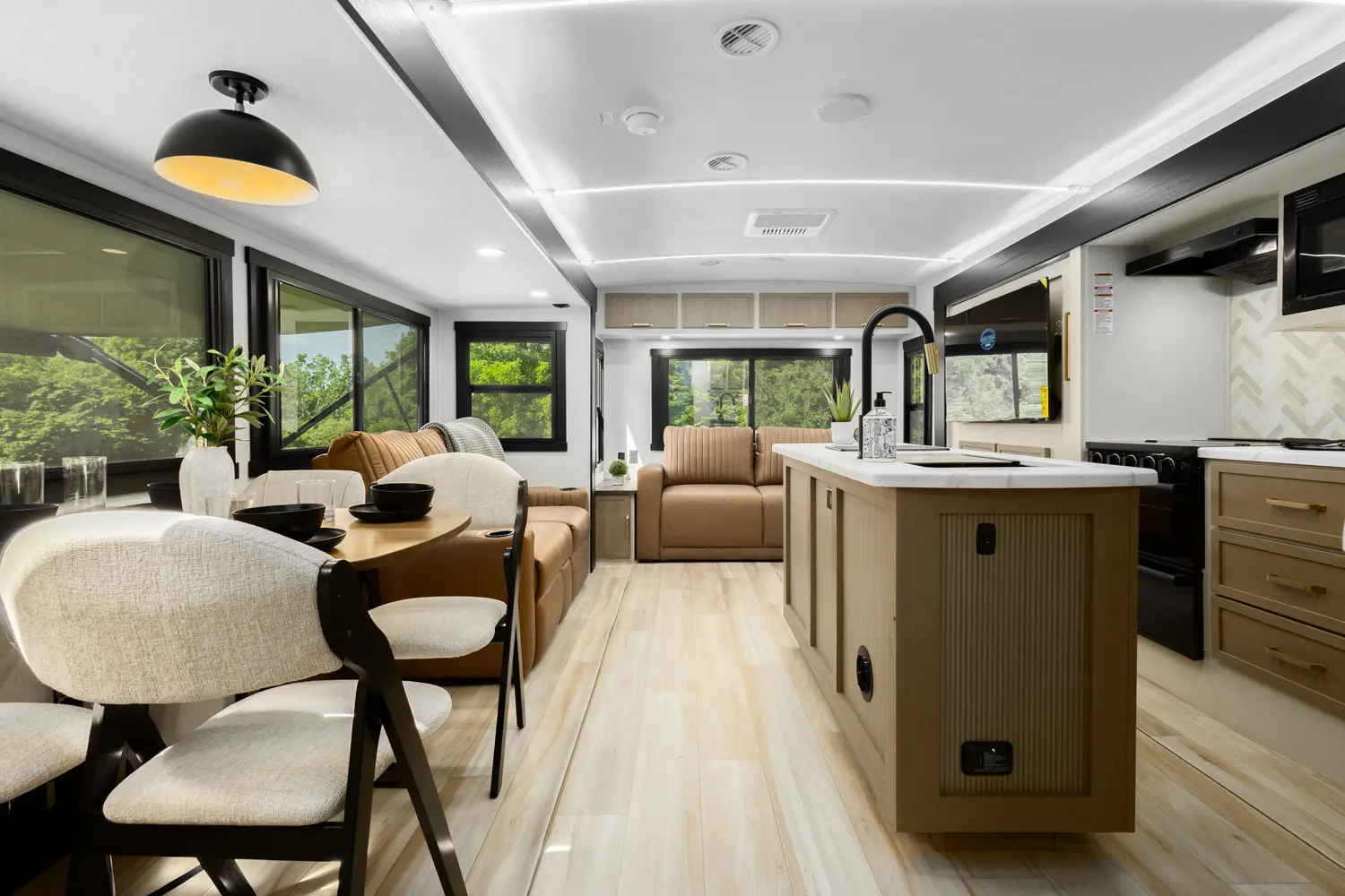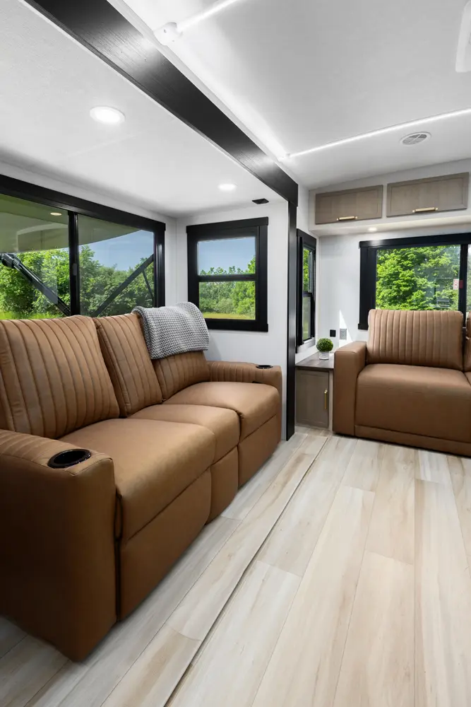 Touting 3 slide-outs, the 308RL is the most spacious Hemisphere Travel Trailer for coupes. Enjoy a breath-taking view of your campsite in the living room or relax in the wide-open bedroom. Past the bedroom you'll find a WALK-IN wardrobe, and washer/dryer prep area spacious enough for separate washer & dryer. (This is the only model without a windshield, because we didn't think your laundry would care to see outside).