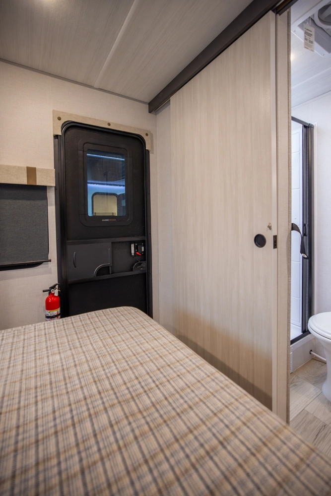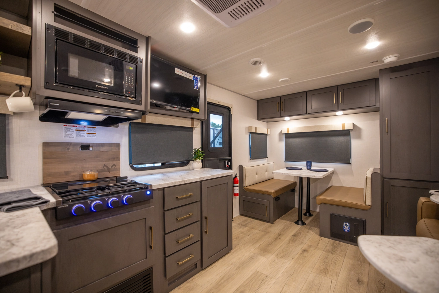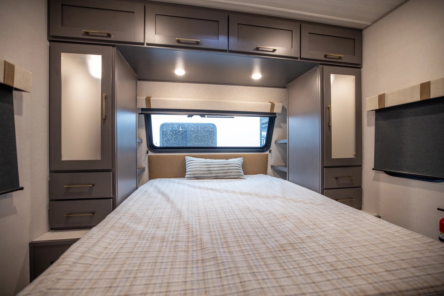 The 25RLSS front master bedroom features a queen-sized bed with dual wardrobes, providing ample storage space. The walk-through bath offers convenient access from both the living area and the bedroom. The rear living space boasts a tri-fold sofa slide-out and a booth dinette, creating a comfortable area for relaxation and dining. The well-equipped kitchen includes a microwave air fryer, refrigerator and large pantry. Exterior features like 12V heated pads and a 19' awning complete this coach.