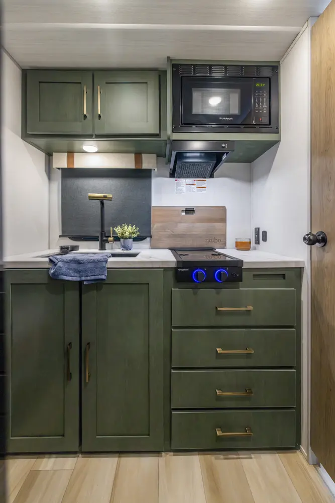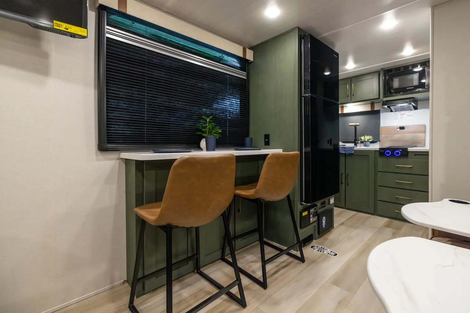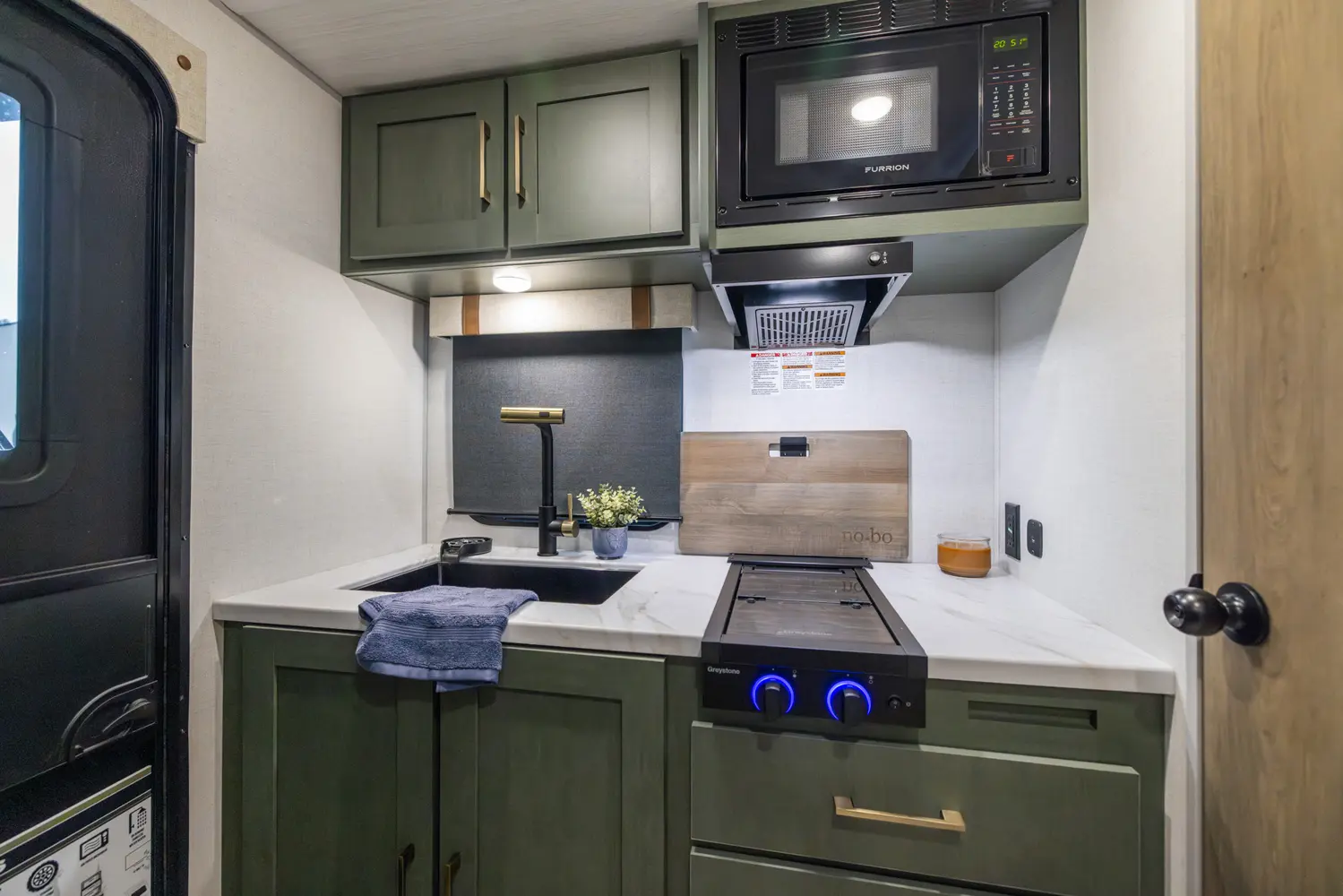 The NB18.2 is a compact, versatile travel trailer ideal for couples or small families. At just over 21 feet, it’s easy to tow and smartly designed for comfort and efficiency. The rear kitchen offers a roomy fridge and two-burner cooktop, while the bar-top counter with flip-up window creates a perfect indoor-outdoor dining space. Lightweight and adventure-ready, the NB18.2 blends comfort, function, and outdoor connection.