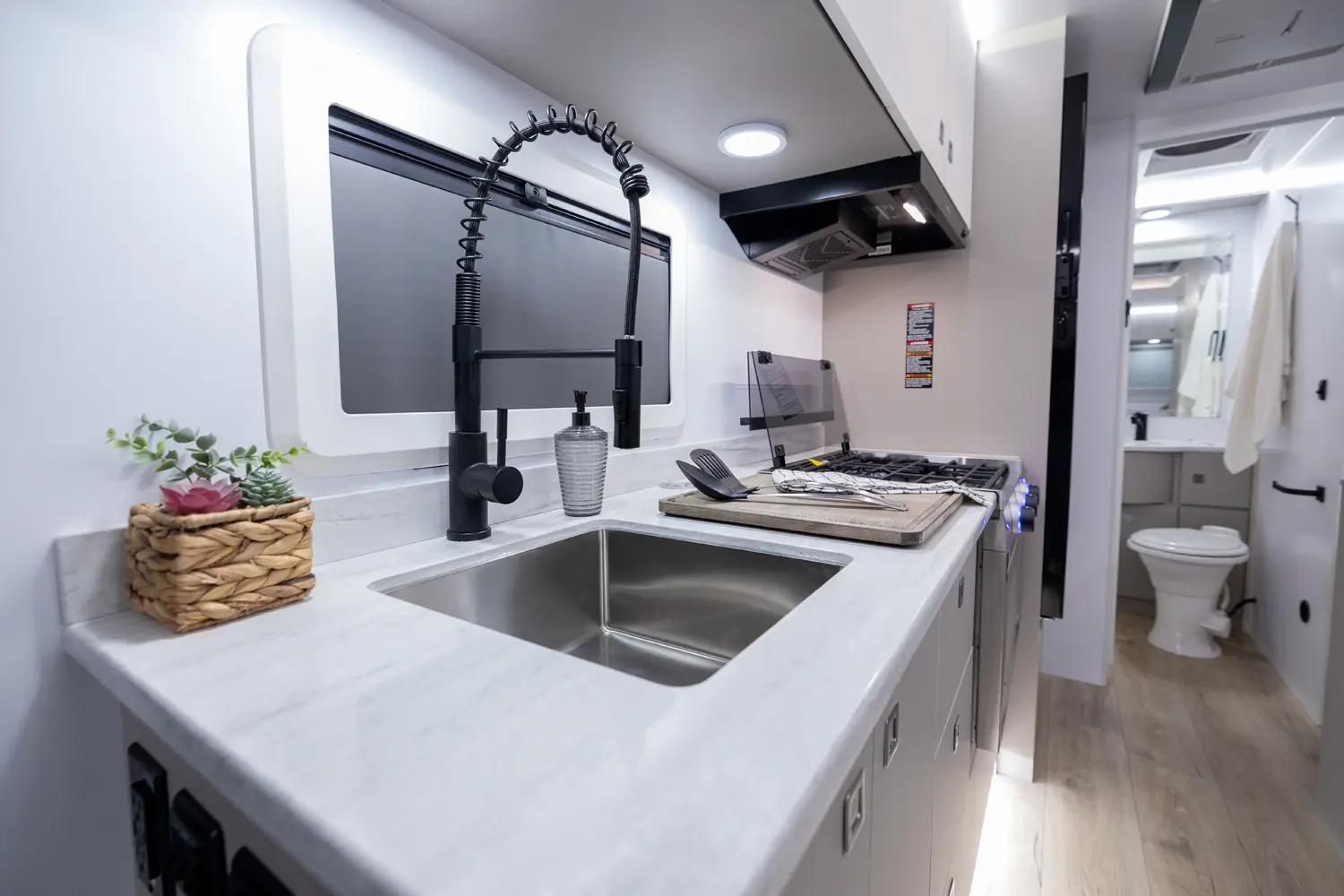 Bringing your mother-in-law on camping adventures is easier than ever with this floorplan! It features a full-size queen, 2 bunks, and a 4-person dinette that converts into an extra bed, ensuring comfortable sleeping for your family. The oversized passthrough storage area and 24 cabinets provide ample space for all your belongings. With the robust solar system, you can go off-grid and operate all trailer components.