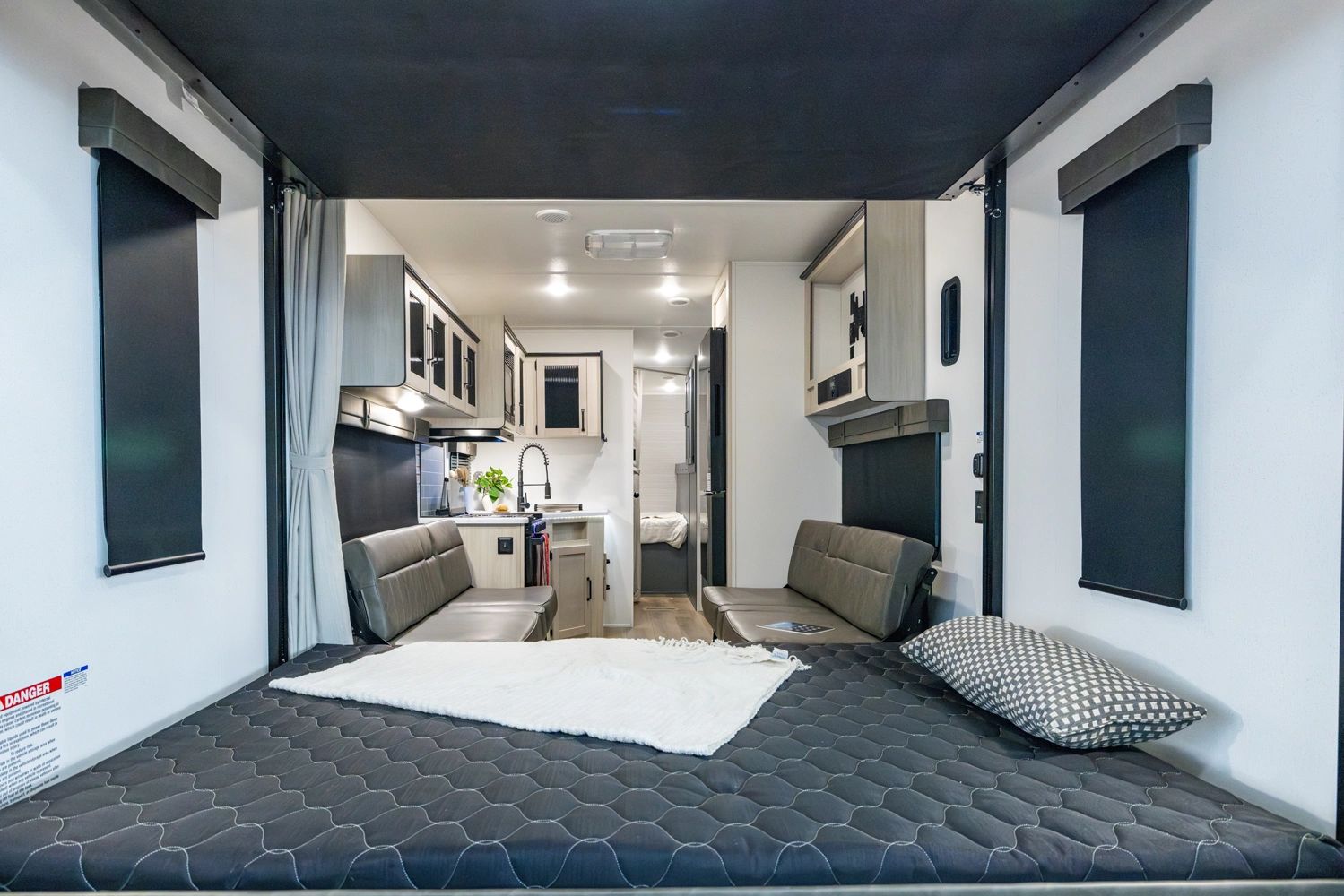 This Toy Hauler is a Travel Trailer that will grant you a vast majority of the layout to be optional cargo area. With 11' of cargo space in the garage, make sure to bring all the toys. The Flip Up Sleeper Sofa's in the garage of this floorplan provide sleeping areas for you and your guests. An optional queen bed electric lift can also be added to the garage for more sleeping quarters, too. Furthermore, an optional outside kitchen can be added for those of you who like to cook in nature.