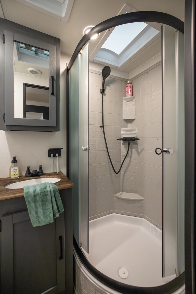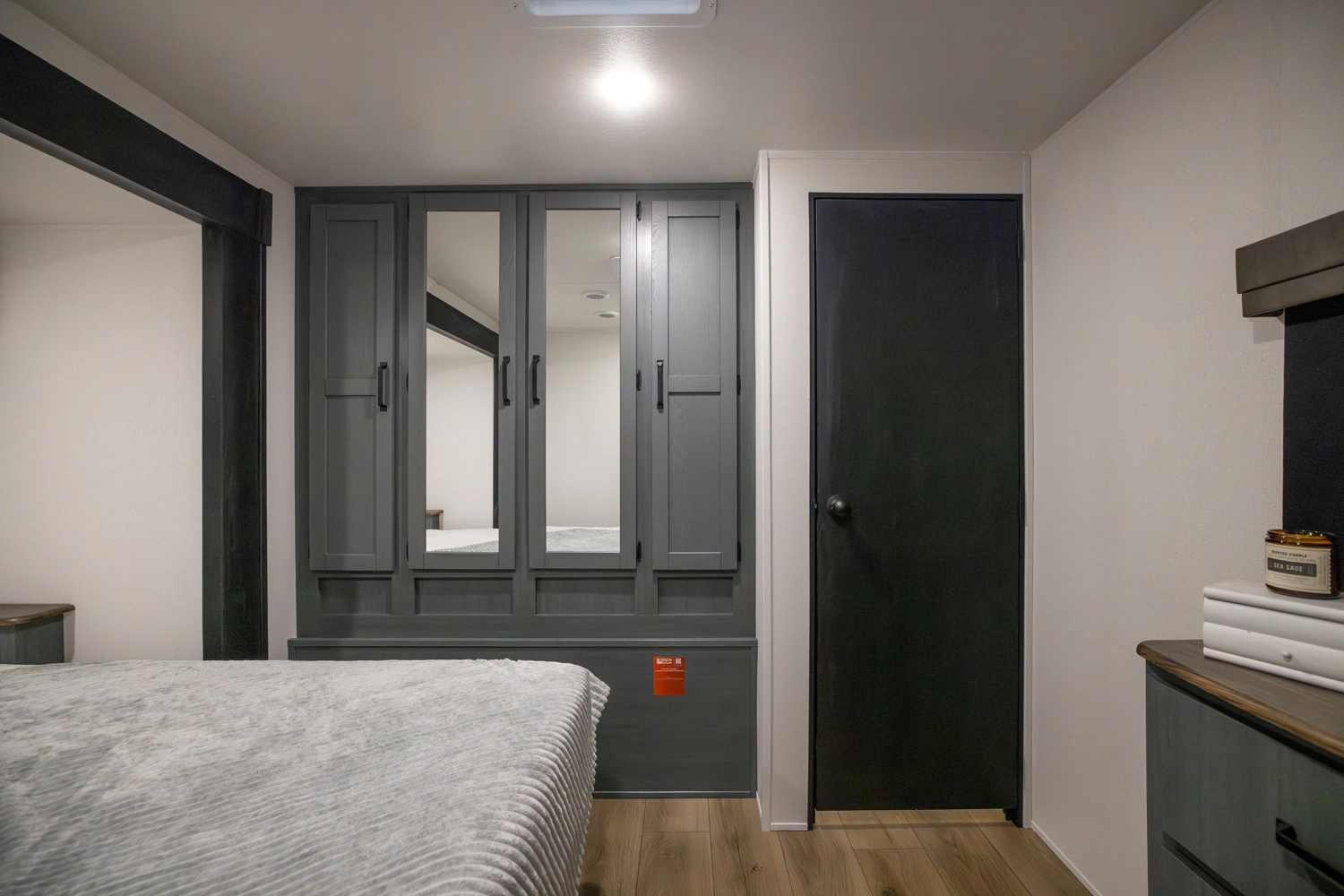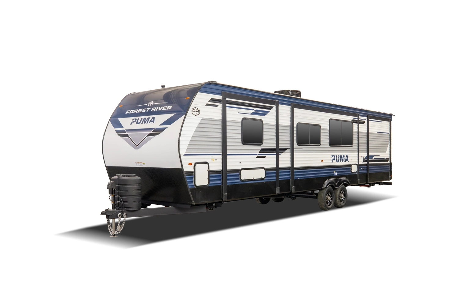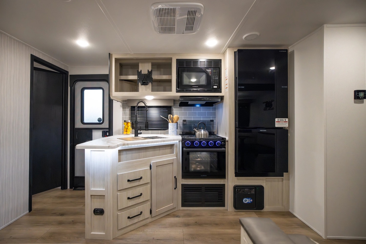This rear bunk travel trailer provides great space for you and all of your family. With three slides, all on one side of the unit, it will grant you and the guests room everywhere you go. The L shaped countertop in the kitchen gives you the ability to entertain without feeling cramped. The front bedroom has a slide out containing a bed, along with a deep closet. Furthermore, you are provided with a great deal of natural light through out with windows in every room.