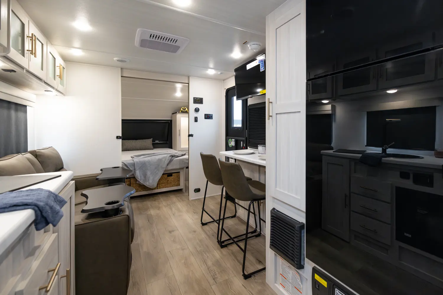This 25' 8" ultra-lite travel trailer offers a spacious layout with a private front queen bed and a full rear bath. The well-equipped kitchen features a bar top with a flip-up window, convection microwave, and 12V refrigerator. Inside, enjoy 64" theater seating for relaxation. Exterior amenities include a 13' power awning and a hot & cold spray port, perfect for compact adventures.