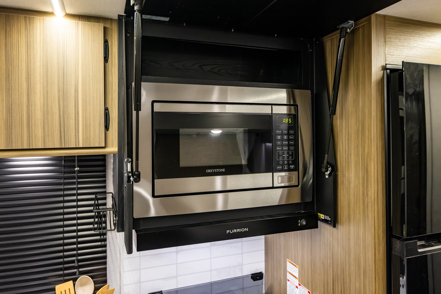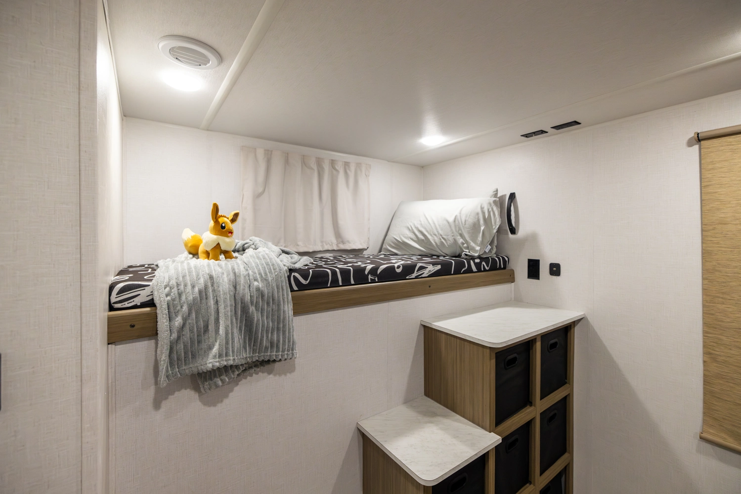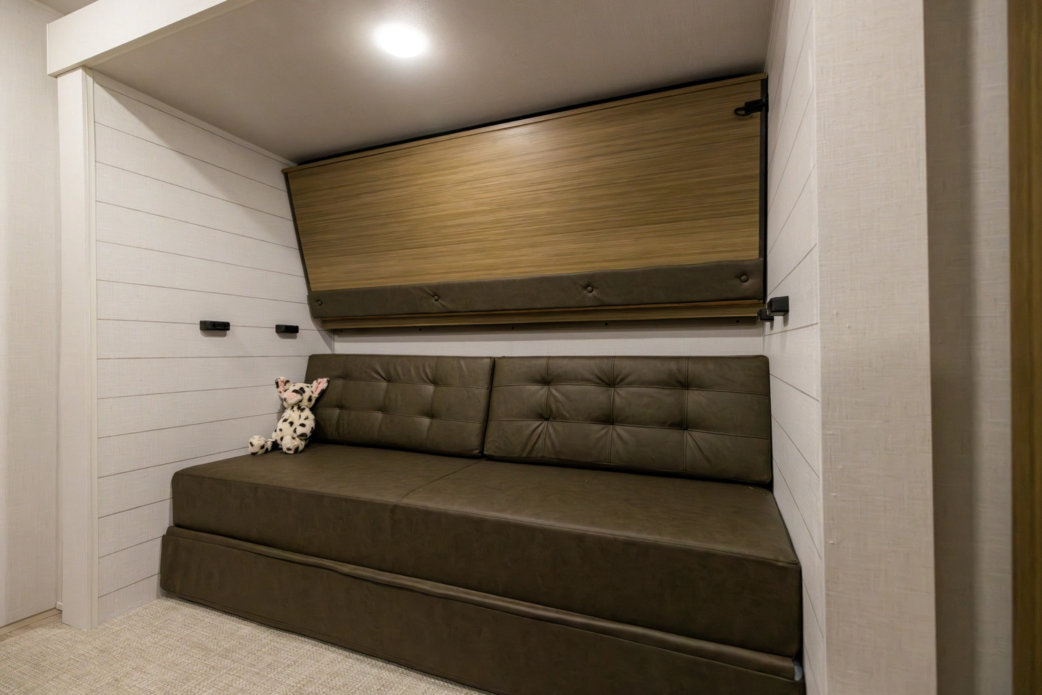 The 33TS is the ultimate bunkhouse, with three total slide outs and an outside kitchen. This well-equipped travel trailer features oversized panoramic windows and the desirable Versa-Lounge. The back-bunk room features the Versa-Queen giving this floorplan the option for two queen beds!