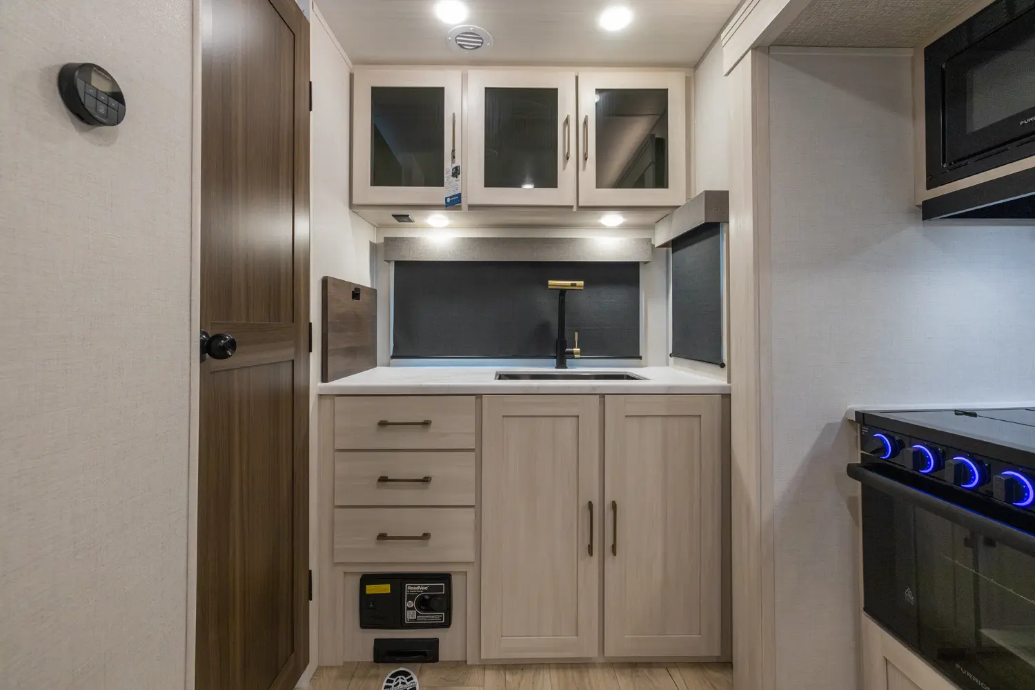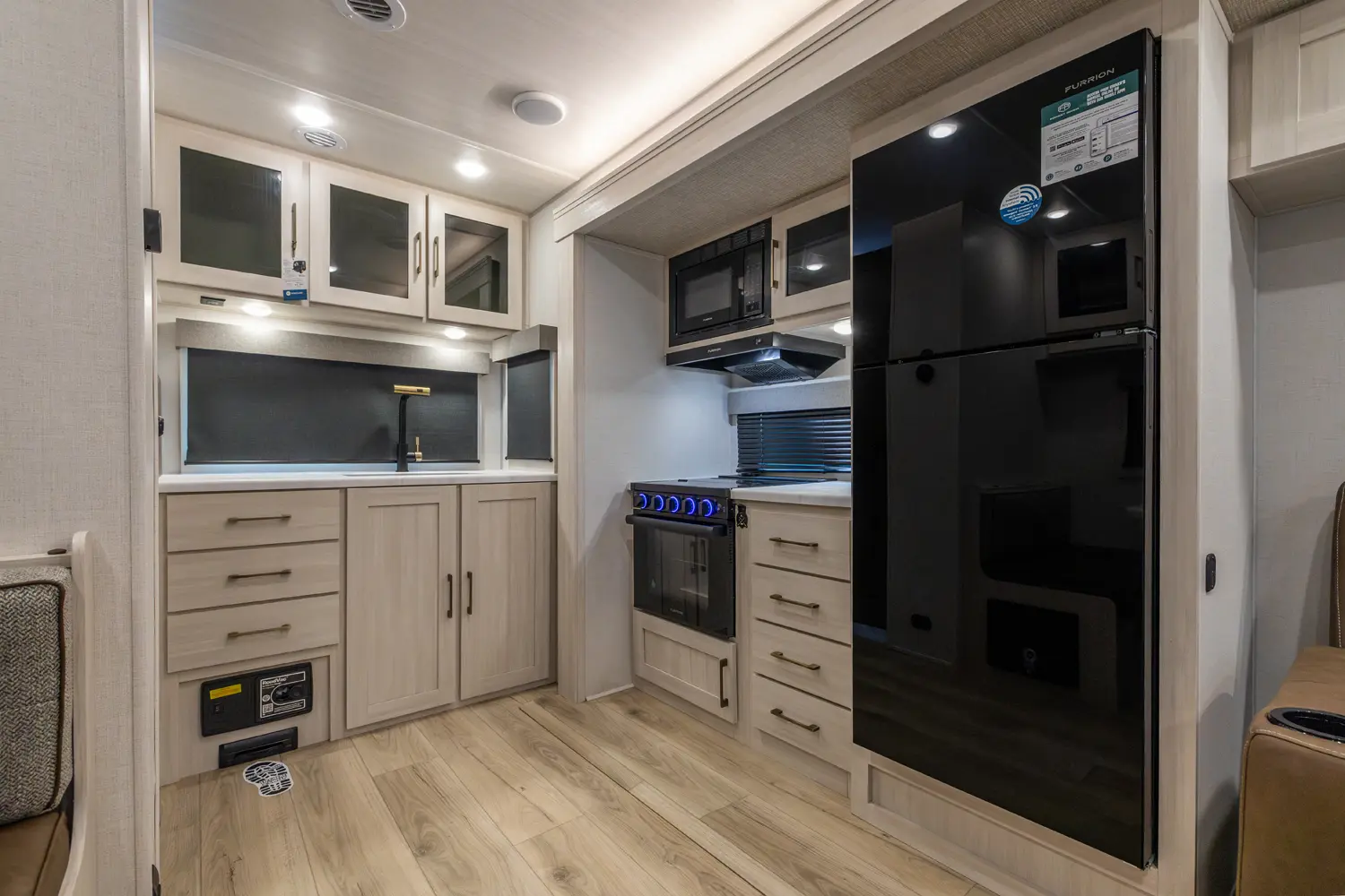 This 27' travel trailer features a front Queen bedroom with dual wardrobes and overhead storage. The kitchen includes a 10 cu. ft. 12V refrigerator and stovetop. Living space includes a sofa and a breakfast bar with two stools. The rear bathroom offers a shower, toilet, and sink. Exterior amenities include an 18' power awning with LED lights and a pass-through storage compartment.