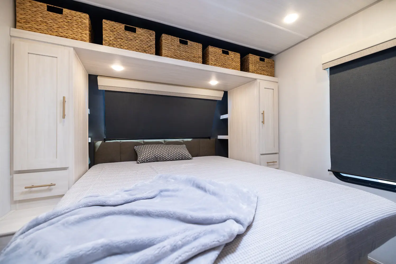 The Un•Mapped 22RB offers a front king bed and full rear bath. The kitchen features a bar top with flip-up window, convection microwave, and 12V refrigerator, plus a bar-to-table conversion for flexible dining. Inside, theater seating provides comfort, while outside, enjoy a TrailGate outdoor bar, 19' power awning, and hot & cold spray port—perfect for compact adventures.