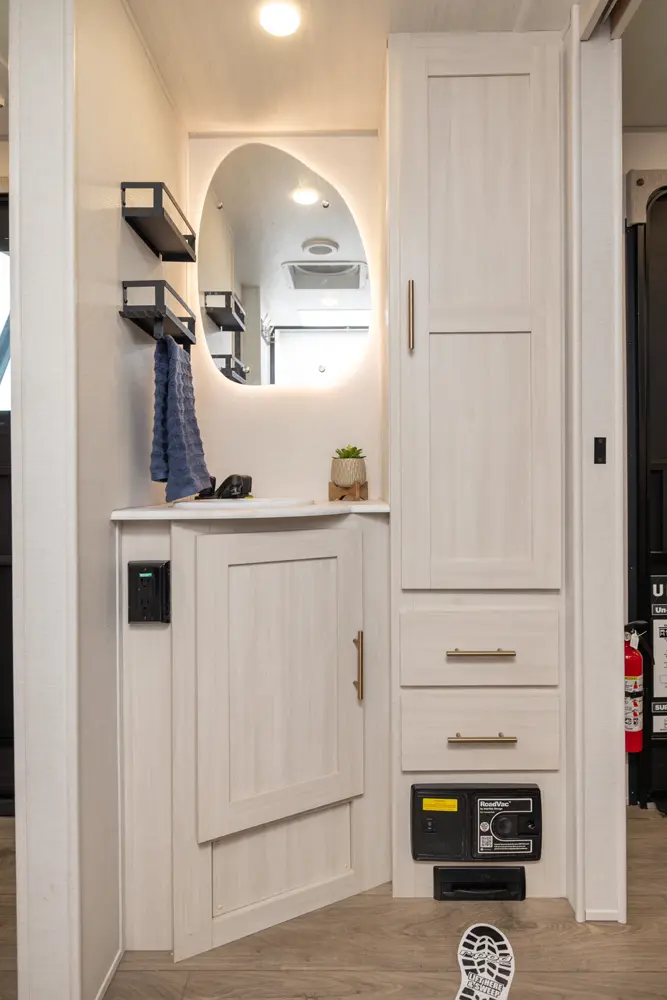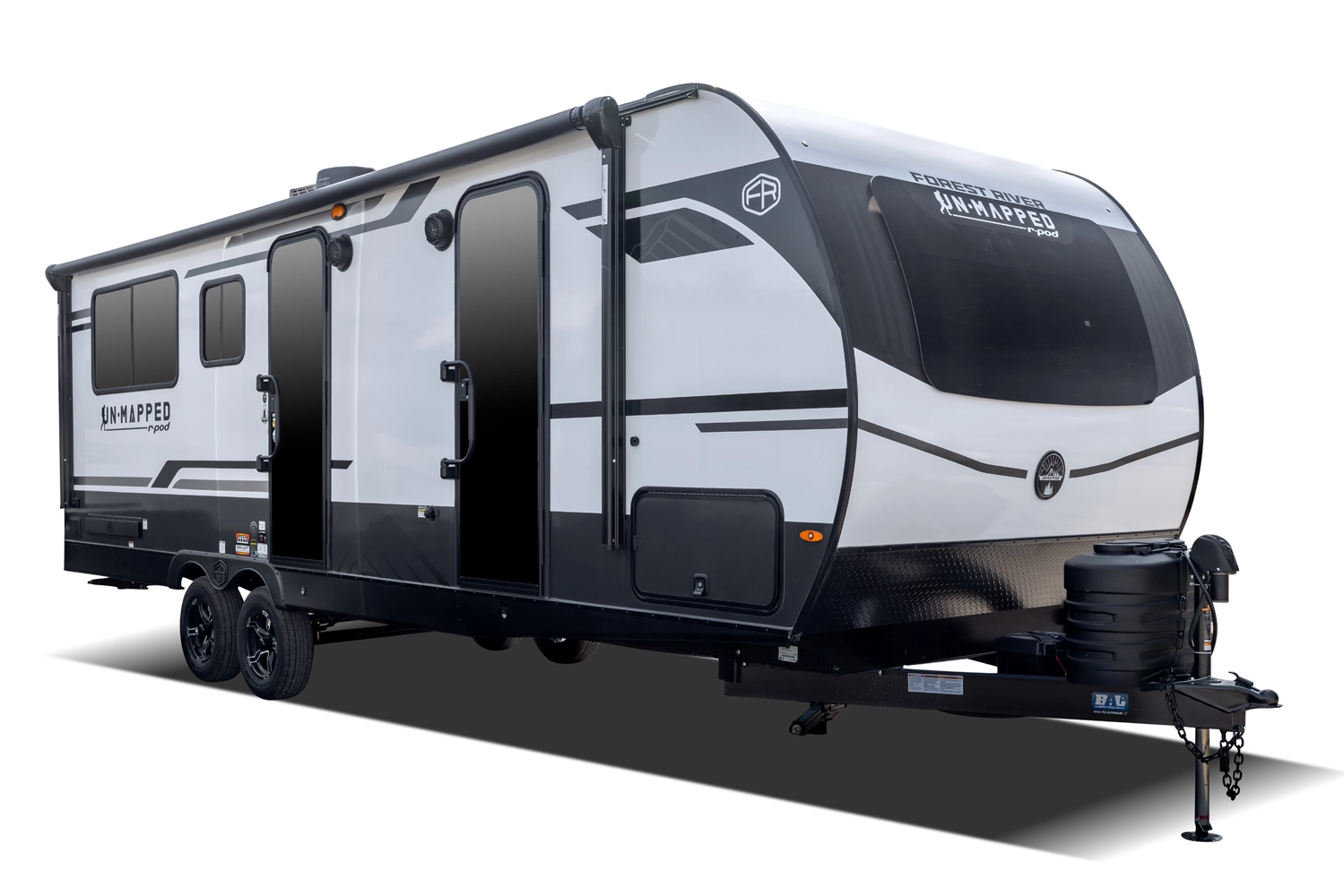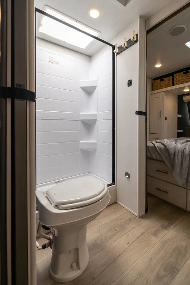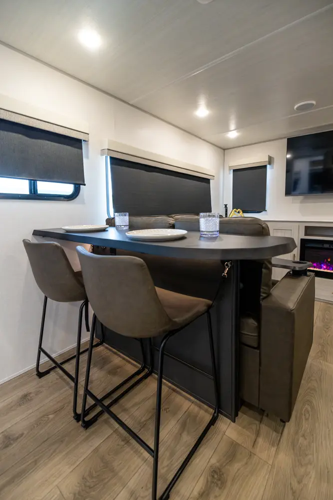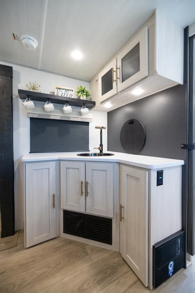 The Un•Mapped 25RL features a rear living area with theater seating and a pull-out ottoman, creating a cozy, flexible space. The kitchen is equipped with a 12V black glass refrigerator and an air fryer microwave. The custom king bed ensures a restful night's sleep. Exterior amenities include a 21' powered awning, outdoor camp kitchen, and a hot & cold spray port, perfect for compact adventures.