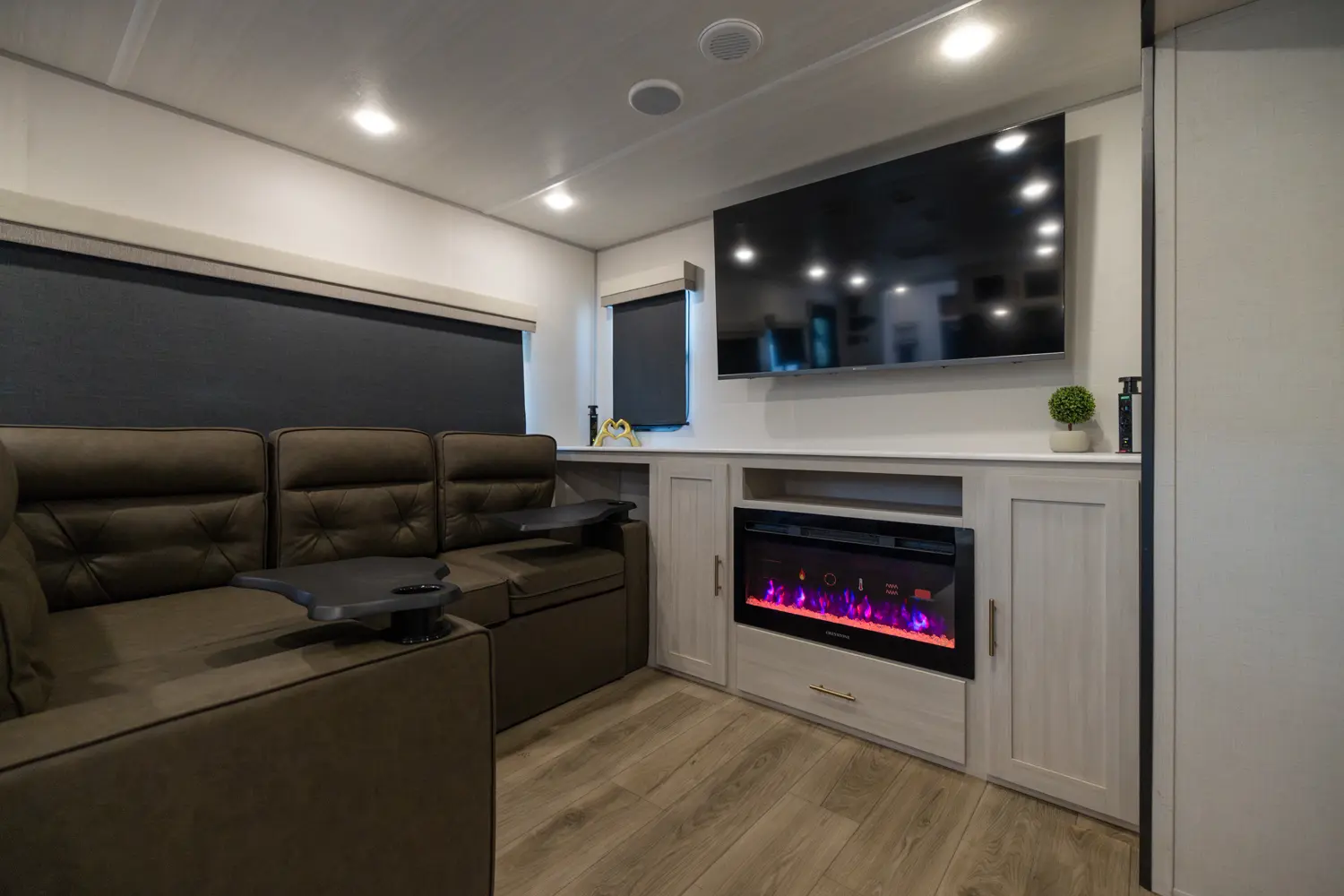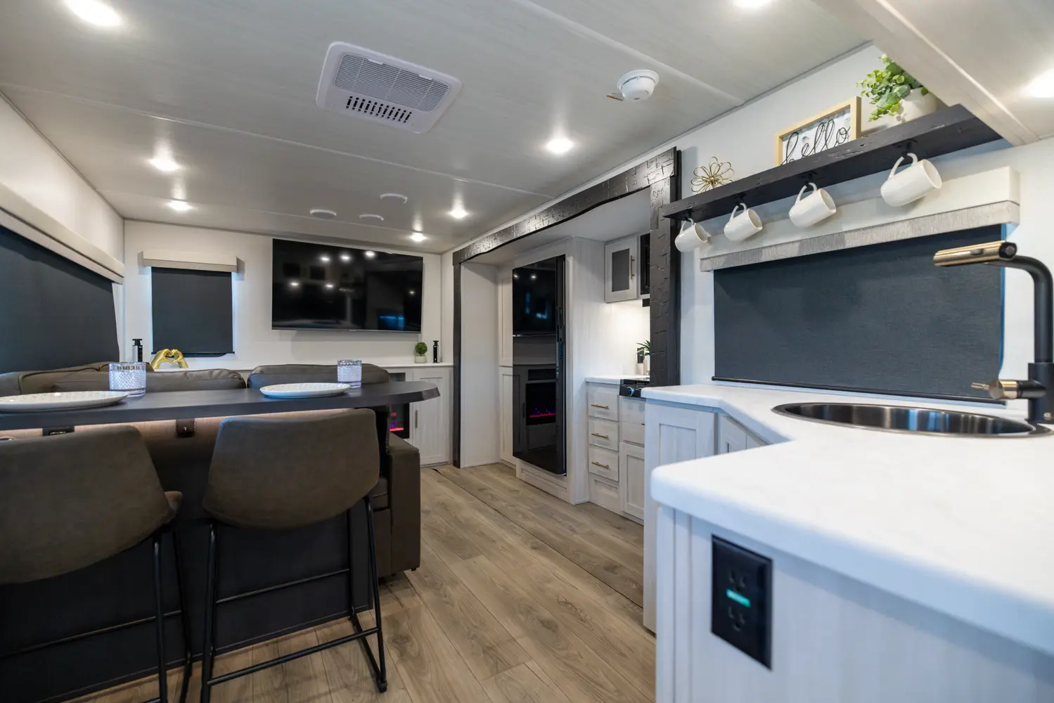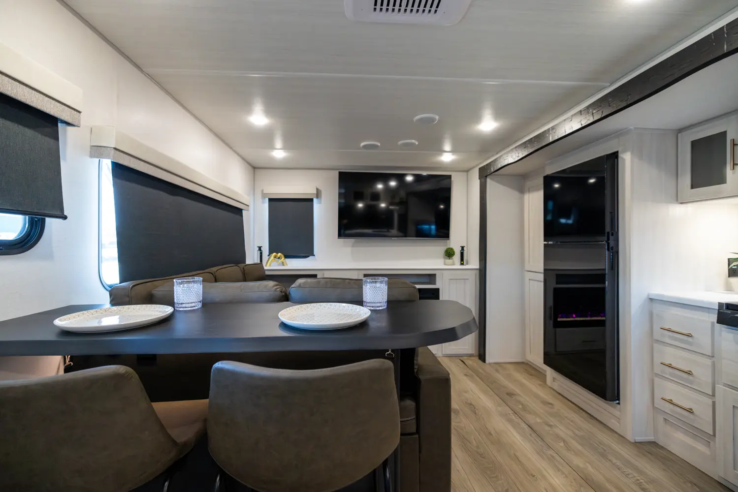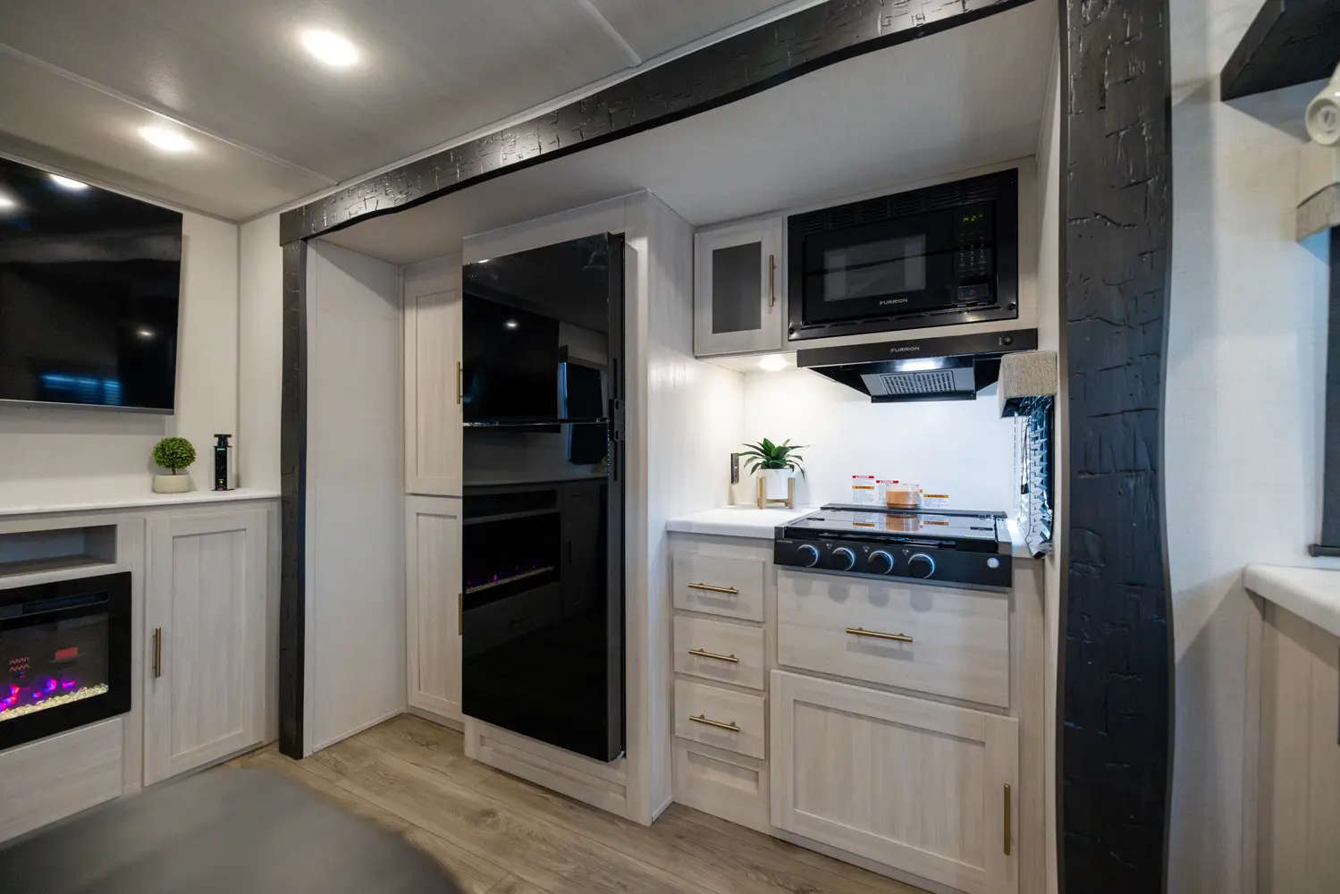 The Un•Mapped 25RL features a rear living area with theater seating and a pull-out ottoman, creating a cozy, flexible space. The kitchen is equipped with a 12V black glass refrigerator and an air fryer microwave. The custom king bed ensures a restful night's sleep. Exterior amenities include a 21' powered awning, outdoor camp kitchen, and a hot & cold spray port, perfect for compact adventures.
