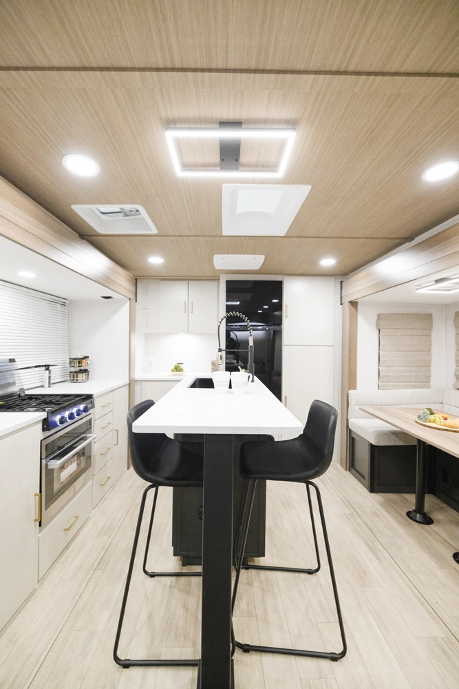 The 3400XL is a luxurious travel trailer perfect for couples or people looking for a large bedroom and plenty entertainment space. This coach features a wine fridge, extra electric fireplace, and a large reach-in closet in addition to your washer/dryer prep. This coach offers the most effective use of counter space and island space. Complete with a King Bed inside of your luxurious master bedroom suite. This travel trailer has everything you need for a fun-packed camping trip.
