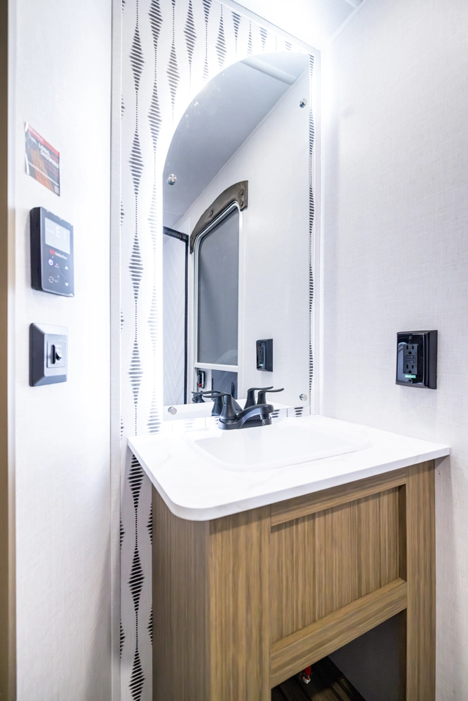 The 26DBUD is the perfect family travel trailer, with double bunks at one end and a queen bedroom at the other. You also get a fireplace (heater), full kitchen with glass-fronted cabinetry and large pantry, a U-dinette, and the customizable Versa-Lounge with Stow N Go Storage.