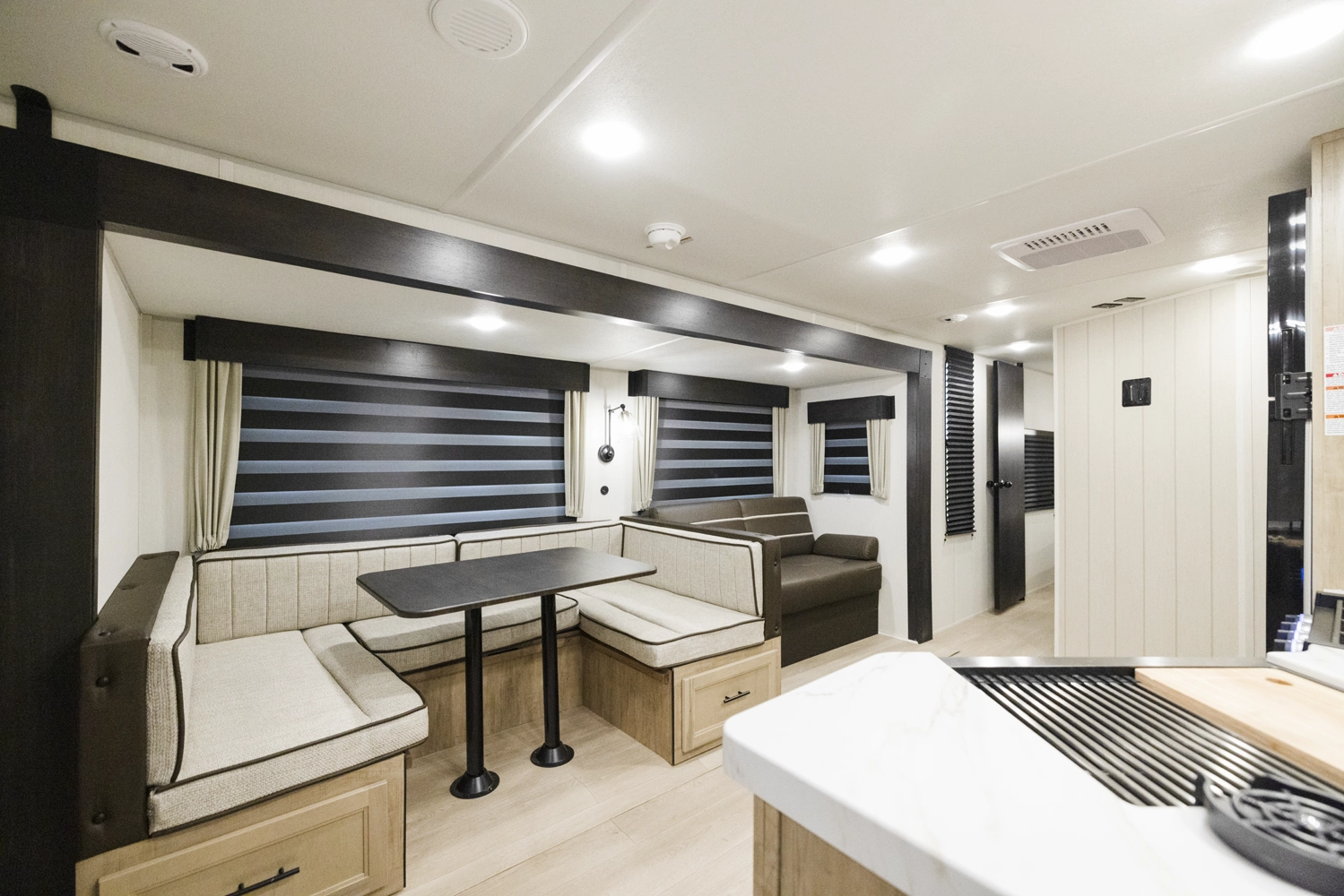 • Cherokee Black Label Wolf Den (Deep Tinted Frameless Automotive Glass Windows, High Gloss Gel Coat Exterior Sidewalls, Multicolor Reading Lights, Pillowtop Mattress Upgrade, Solid Surface Countertops, Thermo Foil Arctic Insulation)