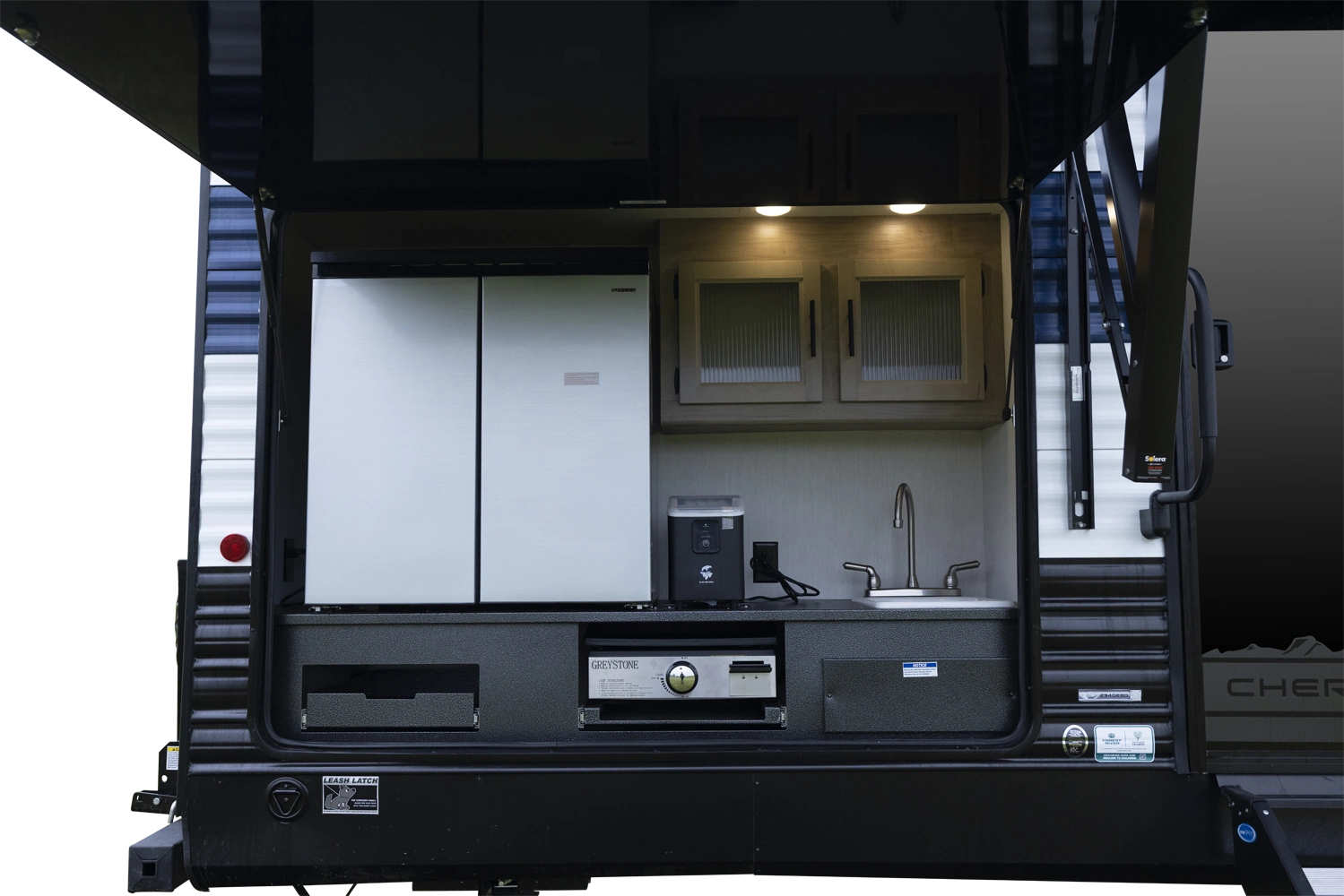 This innovative model lets the customer escape the ordinary with this 3 bedroom model. What separates the 294GEBG from the rest is the rear sleeping areas where a full queen loft bed is featured along with a private bunk area off to the side. This separation created privacy and allows for a Full Bar and Grill featuring an exclusive side-by-side refrigerator and freezer, ice maker, pull-out cooktop, sink and large storage areas.